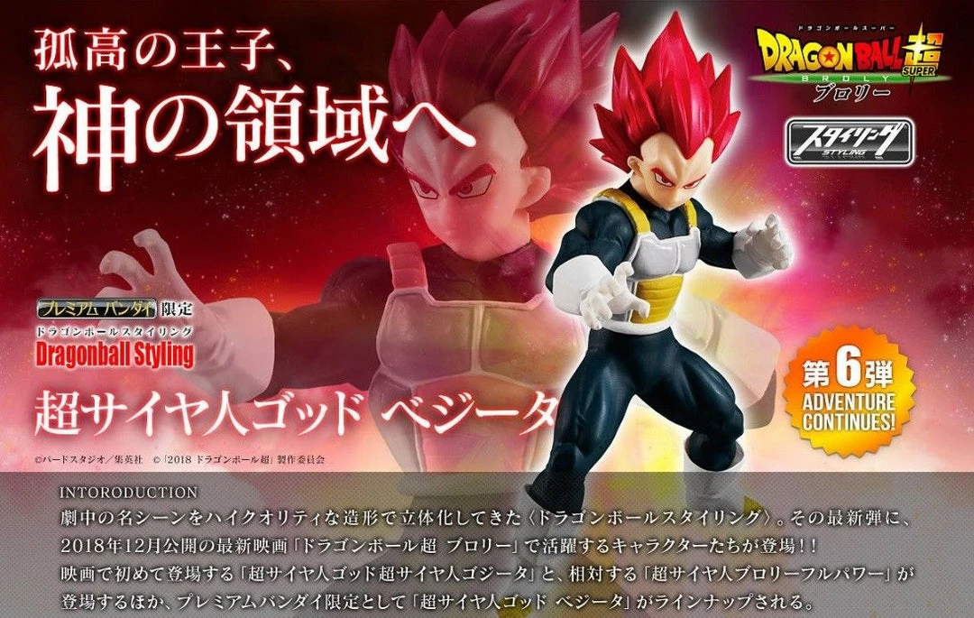 From the Dragon Ball Super Broly Movie comes all new Dragon Ball Styling! Super Saiyan God Vegeta joins the styling line up standing at 4.5 inches tall in his Super Saiyan God Form!