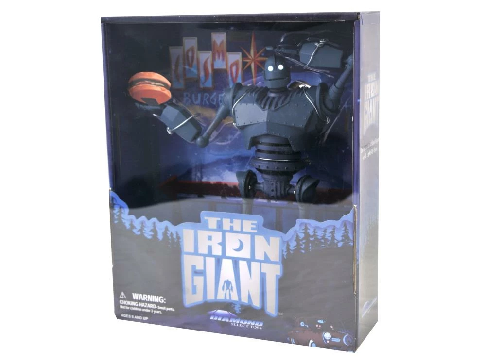 The Iron Giant is what he chooses to be, and when he’s hiding from humans, he chooses to be a Cosmo Burger mascot! Pretending to be part of a billboard for the fast-food chain, the Iron Giant is now available in a Cosmo Burger display box, with a try-me switch on the back of the packaging, to trigger his light-up eyes! This fully articulated 7″ action figure features a working jaw, and is limited to only 3,000 pieces.