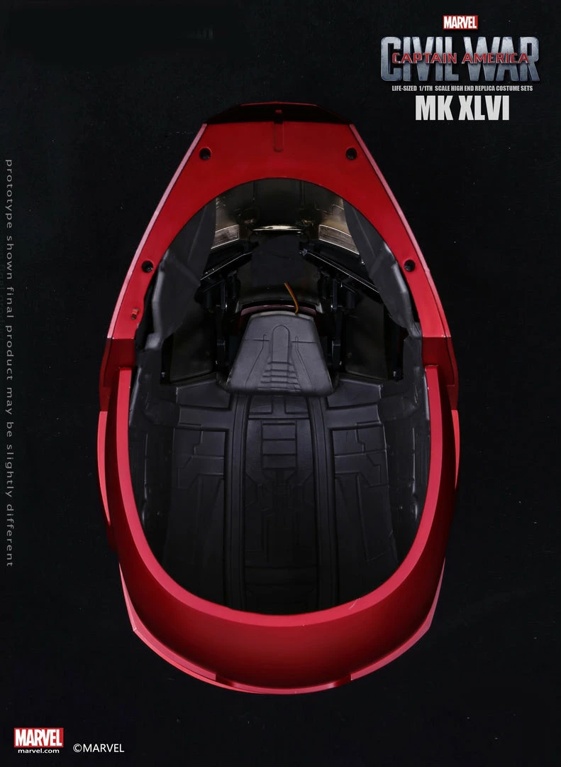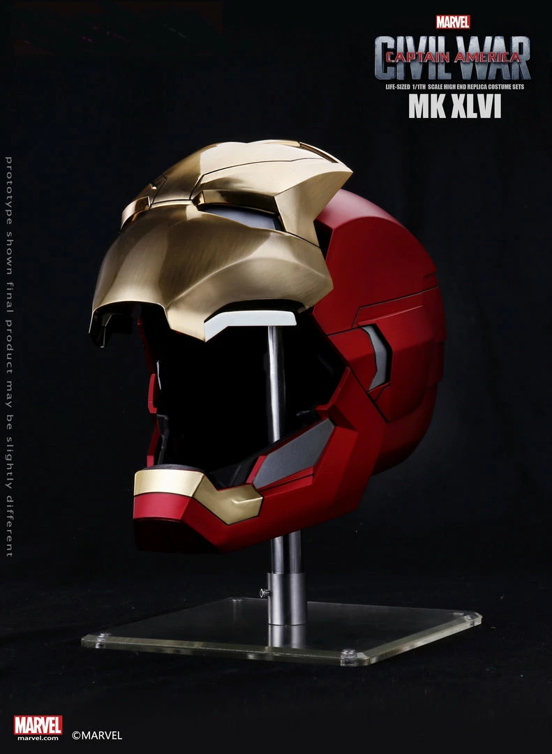 Limited Edition Iron Man Mark XLVI (Mark 46) Life-Size 1:1 Scale Helmet that comes equipped with an electronic open and close feature! This added feature brings a certain ‘life’ to this display piece that traditional 1:1 scale helmets or other props may not have in many cases. This helmet is based on the Iron Man Mark 46 (XLVI) armor design as seen in the popular film Captain America: Civil War. This particular Iron Man armor had a lot of on-screen presence in the film and is one of the more beloved and iconic armors for Iron Man collectors the world over.