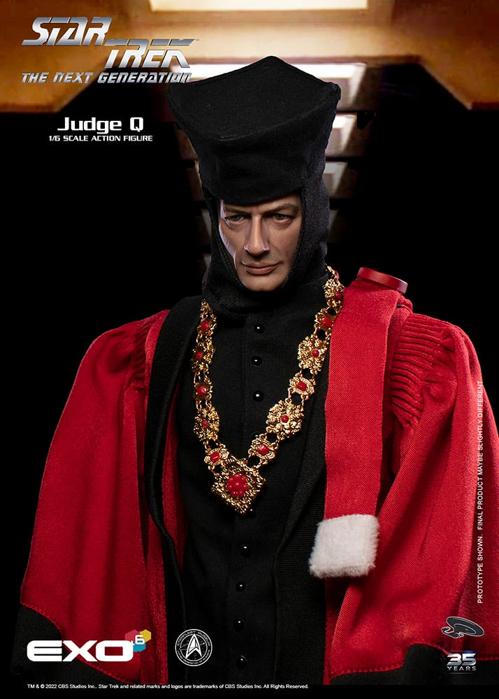 This 1:6-scale figure re-creates this iconic character in exquisite 1:6 detail. Standing approximately 12 inches tall, every element, from his judge’s robes to his chain of office are authentically reproduced. The original portrait sculpt of John de Lancie as Q has an authentic, hand-painted likeness.