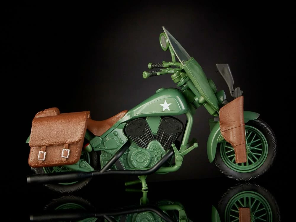 Steve Rogers, better known as Captain America, rides his vintage motorcyle into battle. Captain America comes equipped with his trusty shield, a pistol, a knife, and a machine gun; and the motorcycle features removable saddlebags.