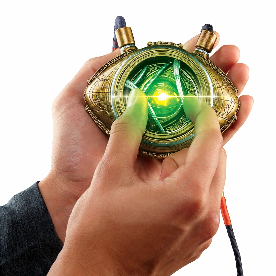 The eerily magical experience starts with pressing a button to awaken and open the Eye. The mechanism triggers the eyelid to open spookily to reveal the shining jewel-like Time Stone. Assume the role of an all-knowing sage super hero with this Eye of Agamotto inspired by the Marvel Cinematic Universe and Marvel comics.