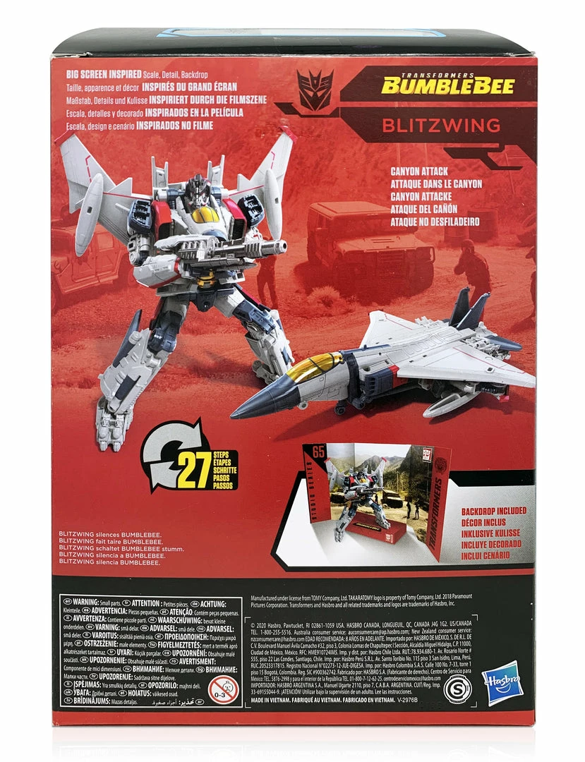 This Studio Series 65 Voyager Class Transformers: Bumblebee-inspired Blitzwing figure converts from robot to Cybertronian jet mode in 27 steps. Remove backdrop to showcase Blitzwing in the Canyon Attack scene. Figure features vivid, movie-inspired deco.