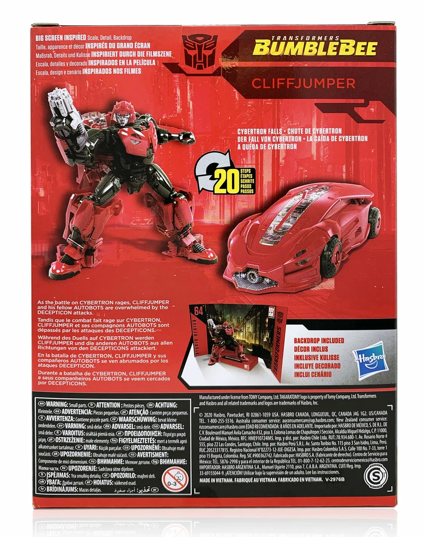 This Studio Series 64 Deluxe Class Cliffjumper figure features vivid, movie-inspired deco and converts from robot to car mode in 20 steps. Remove backdrop to showcase Cliffjumper in the Cybertron Falls scene.