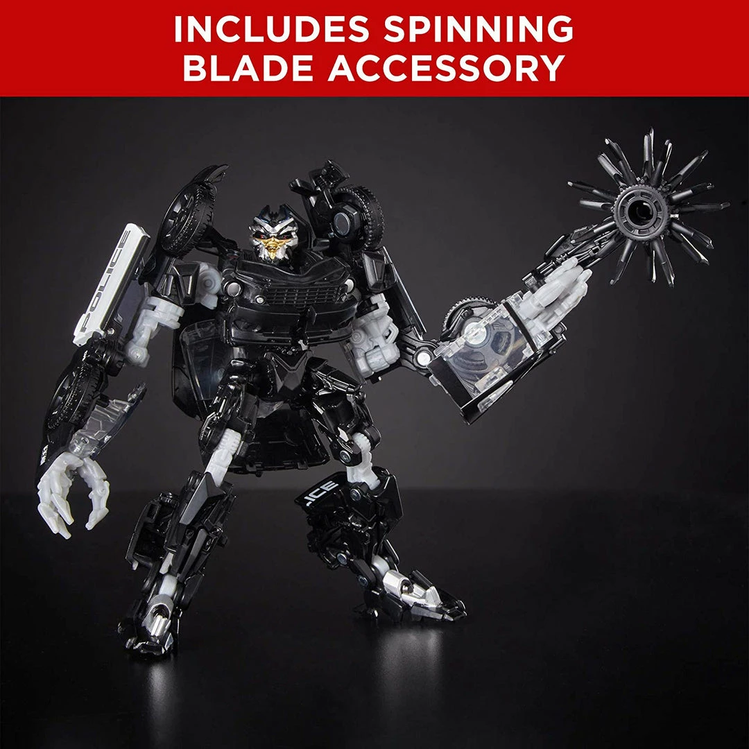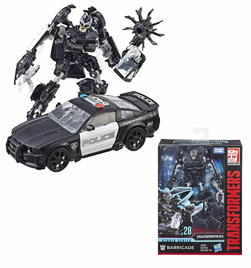 This Studio Series 28 Deluxe Class Transformers Movie 1 Barricade figure converts from robot to Saleen S-281 Extreme police car mode in 20 steps. Remove backdrop to showcase Barricade in the Police Chase scene. Figure features vivid, movie-inspired deco and includes a detailed weapon accessory, the spinning blade weapon accessory modeled after the weapon Barricade uses in the film.