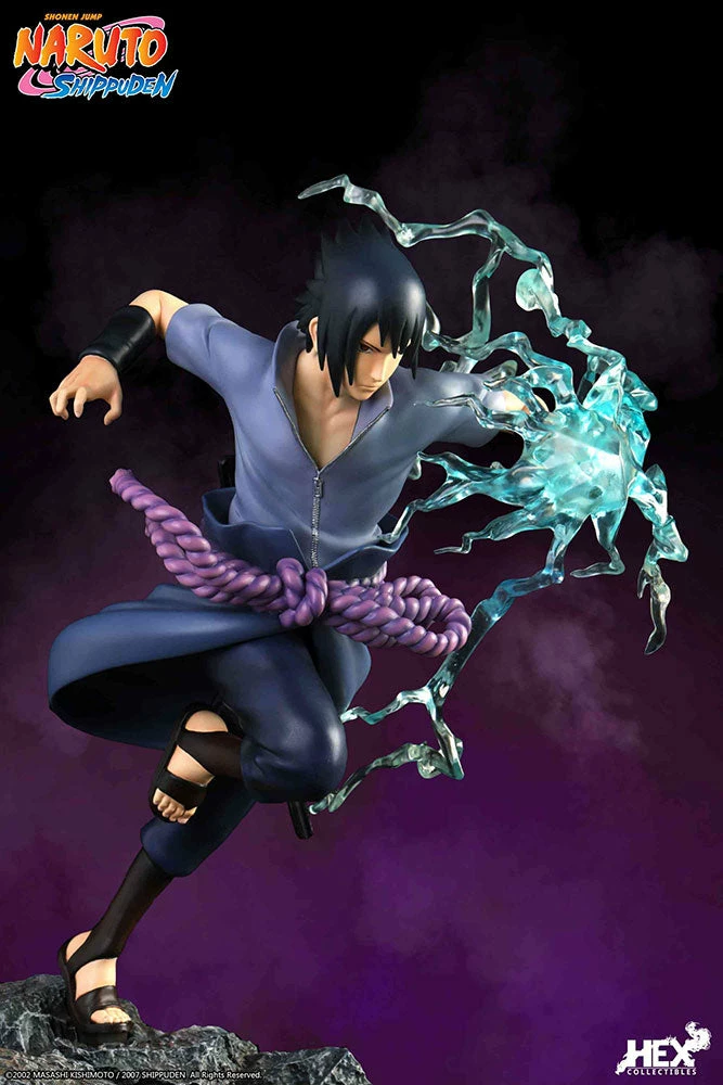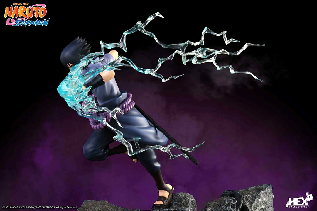 Sasuke wears his iconic uniform with the Uchiha family crest on the back and a Kusanagi no Tsurugi tied around him, both being crafted with perfect accuracy and attention to detail.
