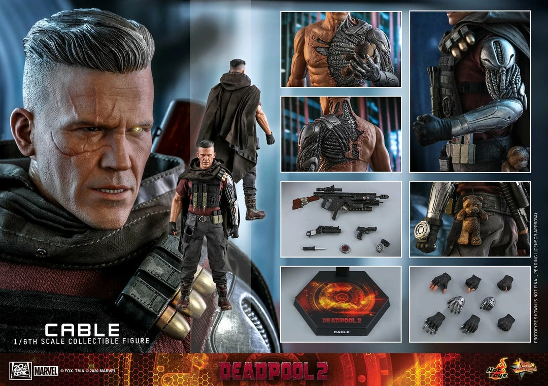 The highly-accurate figure is specially crafted based on the appearance of Josh Brolin as Cable in Deadpool 2, and features a newly developed head sculpt with battle scars and LED light-up function on his left eye; accurate silver-grey colored hair sculpture; a completely newly designed body and a highly-detailed bionic arm, carefully painted in multiple shades of metallic colors. The costume is a skillfully tailored military outfit with a heavy weathering effect. A number of matching interchangeable gloved hands and mechanical hands are included as well as an array of extensive weapons and accessories including Cable’s signature heavy machine gun, a grenade launcher, a pistol, a dagger, a bomb, a time-traveling device, multiple numbers of removable bullets and firearm magazines, an iconic teddy bear doll with significant burnt marks; and a collectible figure base.