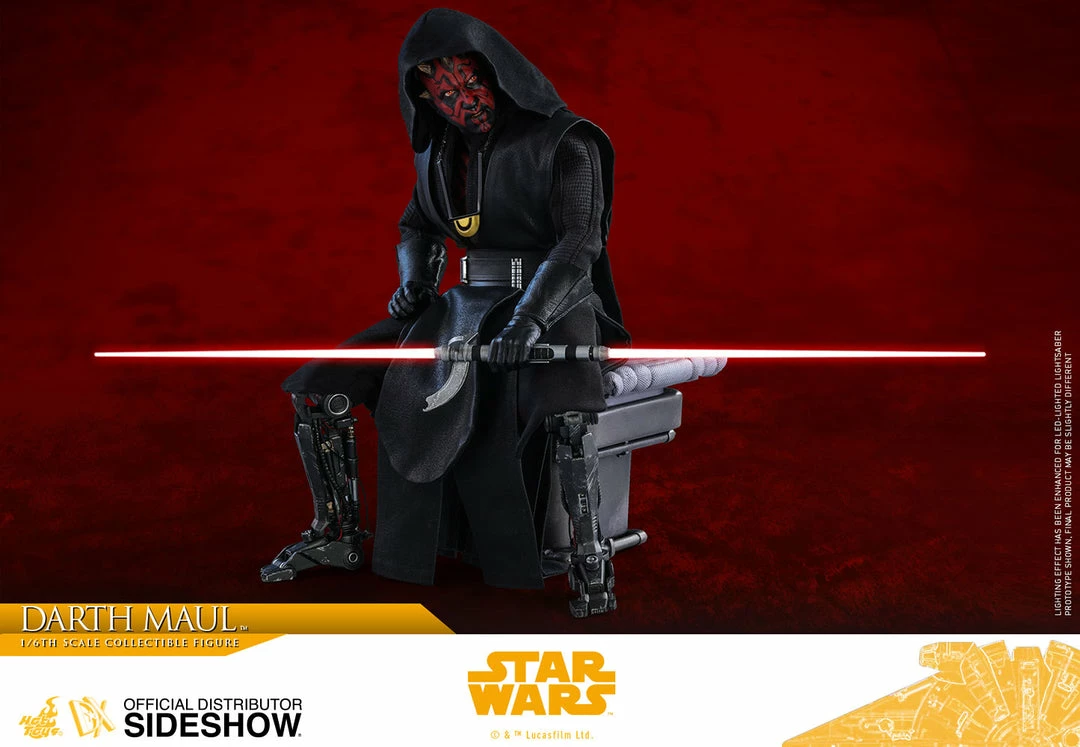 Skillfully crafted based on the appearance of Darth Maul in the film, the sixth scale collectible figure features a newly developed head sculpt with stunning likeness, finely tailored outfit and robe, highly detailed robotic legs, Maul’s iconic double-bladed lightsaber with LED light-up function and interchangeable lightsaber blades emulating the weapon in motion. This figure also includes a selection of interchangeable hands for posing options, a specialized seat for Maul and a figure base.