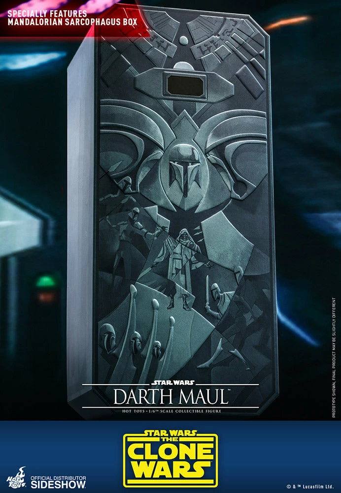 Skillfully crafted with authentic styling, the sixth scale collectible figure features a newly developed head sculpt with stunning likeness and separate rolling eyeballs system, finely tailored outfit, highly detailed mechanical legs, Maul’s iconic double-bladed lightsaber and interchangeable lightsaber blades emulating the weapon in motion, a selection of interchangeable hands for posing options, and a specially designed Mandalorian sarcophagus inspired box.