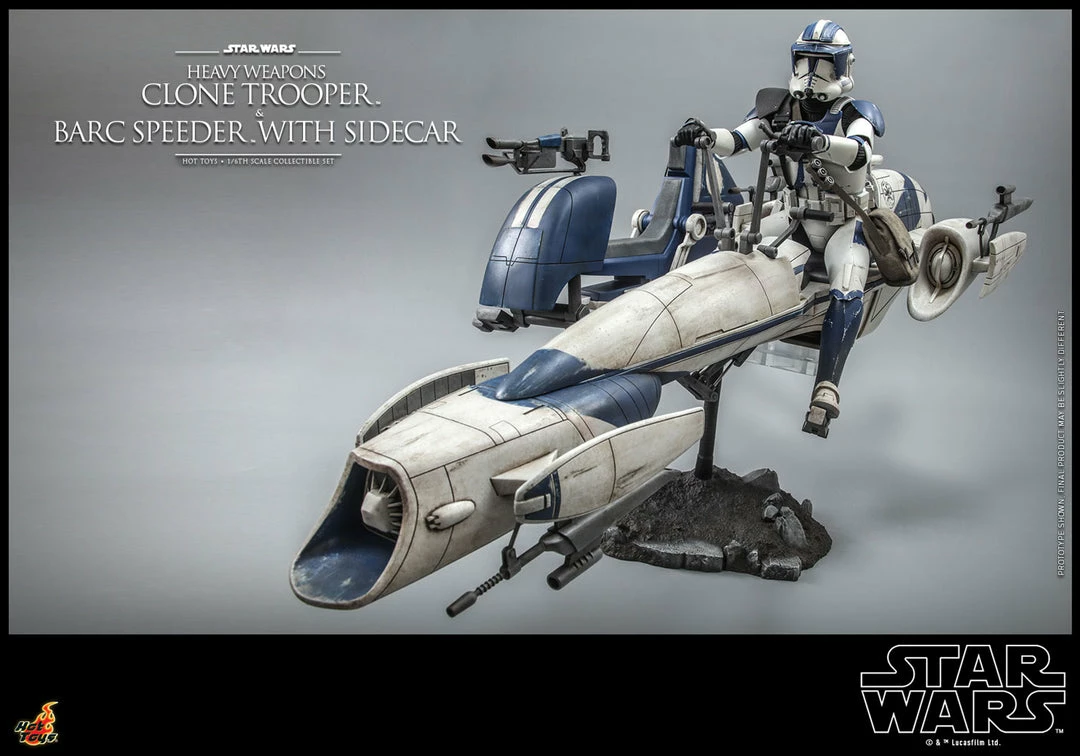 The brand new sixth scale BARC Speeder measures at 68cm in length and comes with an attachable sidecar armed with an articulated blaster. The vehicle has a detailed mechanical structure, astonishing paint application with weathering effects, articulated handlebars, and a rocky themed base for a variety of poses. Â