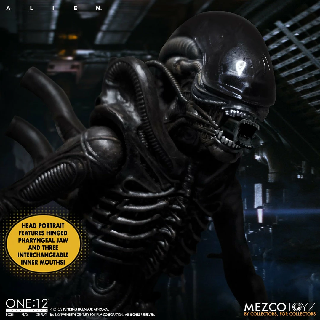 The One:12 Collective Alien features an all-new seamless body designed with an internal skeleton armature that is durable yet highly poseable. The hostile xenomorph is equipped with a hinged pharyngeal jaw and interchangeable inner mouths, as well as an interchangeable chest plate pierced by the ASSO-400 Harpoon Grappling Gun, as seen in the final scene of the movie.