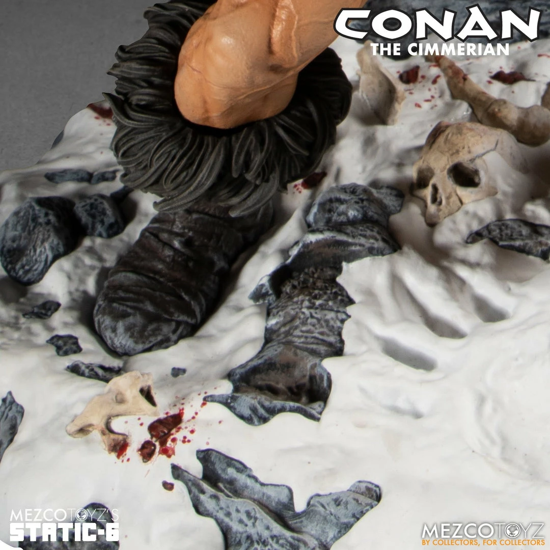 The Mezco’s Static Six: Conan The Cimmerian statue is based on Robert E. Howard’s legendary character. Conan stands atop a snow dusted terrain, littered with skulls at his feet. The Cimmerian is set to strike his enemy, sculpted in a powerful stance wielding weaponry of your choosing. The Mezco Static Six Conan includes two interchangeable heads – a scowling stare and roaring helmeted portrait, as well as interchangeable weapons and arm gestures allowing for a multitude of display options.