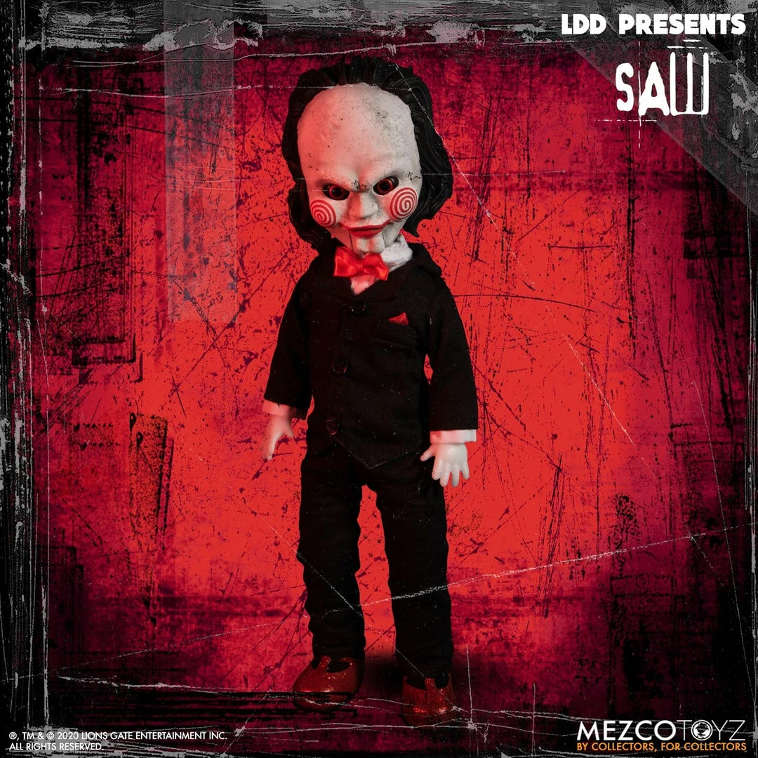 This Living Dead Dolls Presents Billy figure wears his signature tuxedo, bowtie, and red shoes based on the film series. His unique head sculpt features protruding cheeks with spiral detailing, and his signature red lips that form a maniacal grim. His dark eyes and red irises see every move you make.