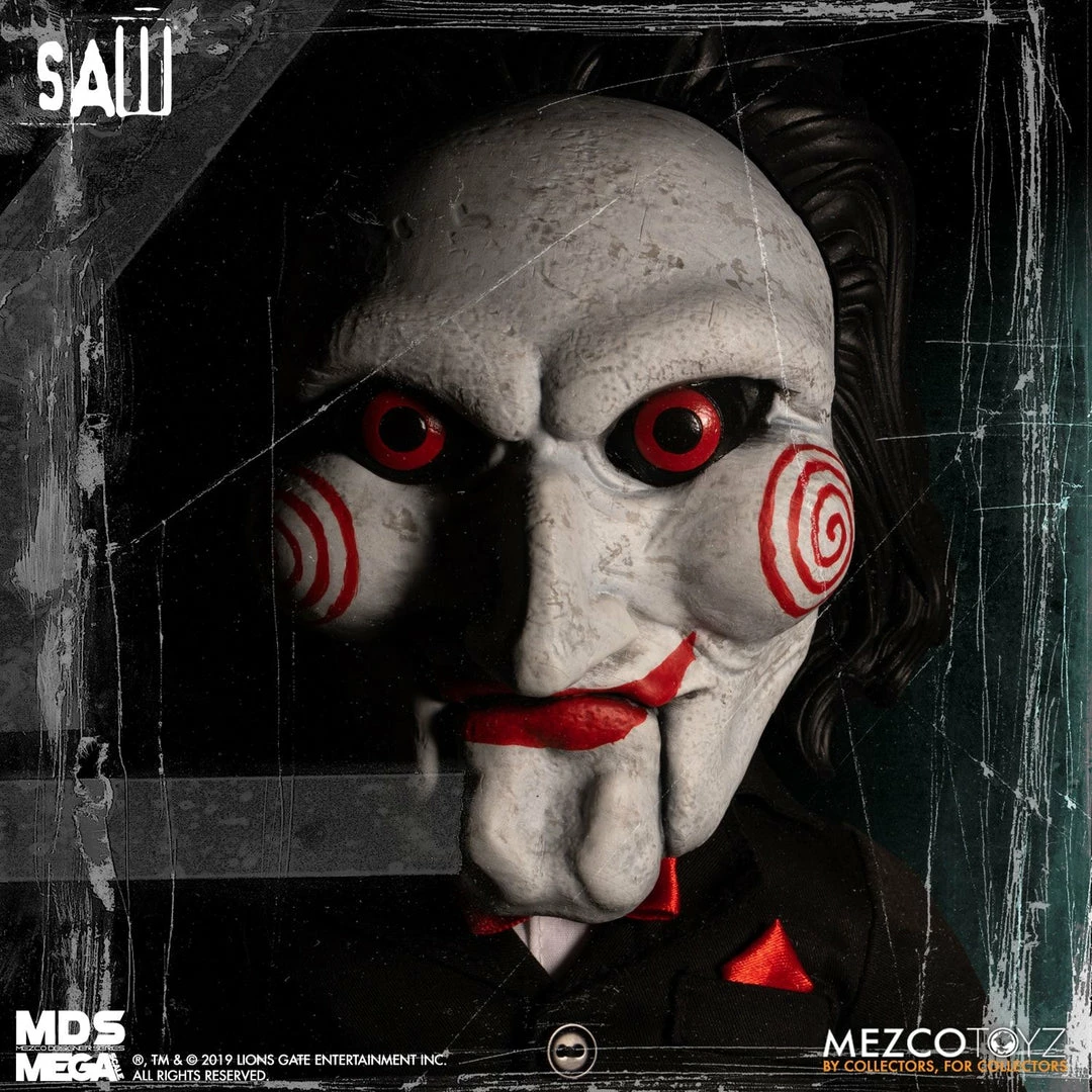 From the Saw series, the Designer Series Mega Scale Billy stands 15 inches tall with 11 points of articulation and features talking effects. With his blackened eyes and red irises always watching, Billy is dressed in his infamous tuxedo and bowtie.