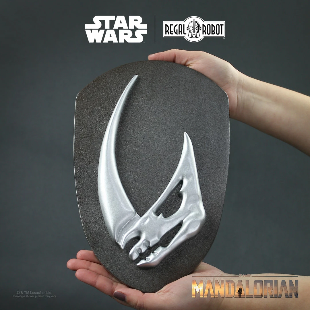 From the Disney+ series, The Mandalorian, Regal Robot presents the Mudhorn Signet Plaque, inspired by the season one finale. Measuring 11 inches, the faux metal mudhorn was digitally recreated with reference from Lucasfilm and is cast in resin. The signet comes mounted to a uniquely shaped wood plaque, painted in a distressed metallic mimicking the scorched beskar armor.