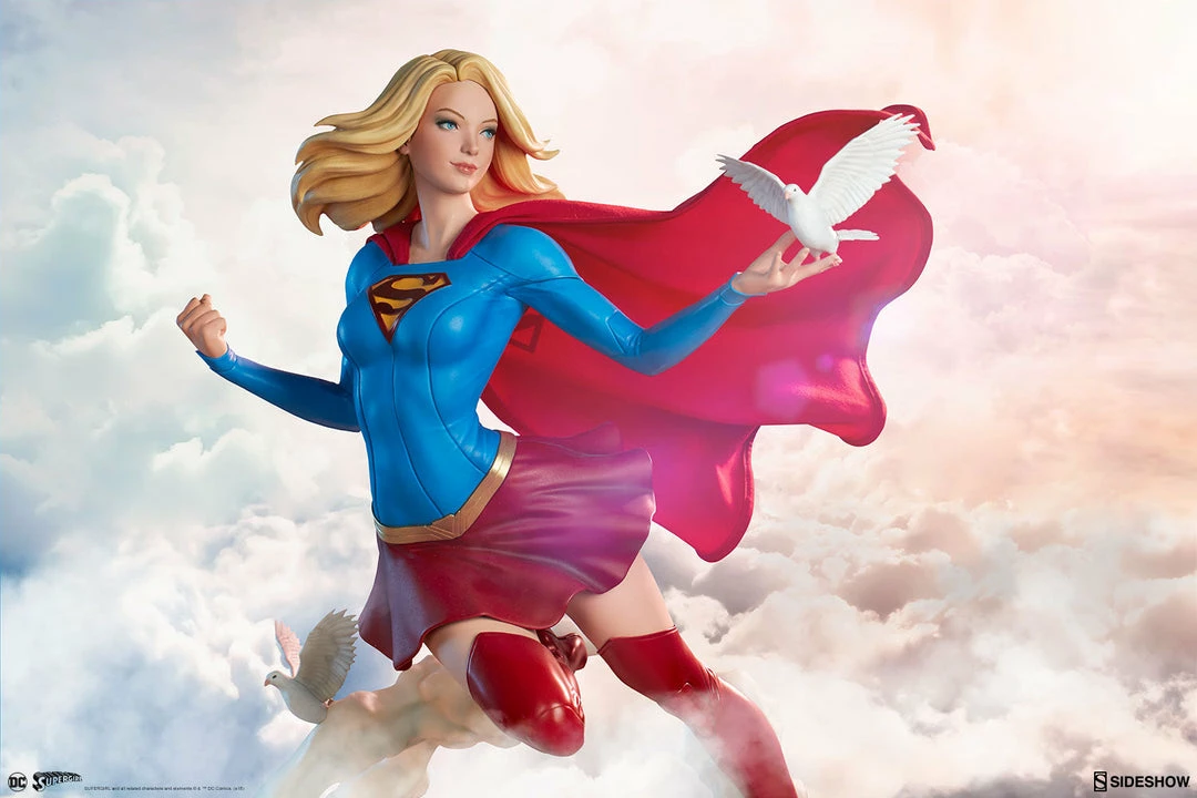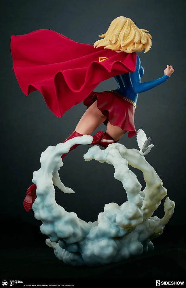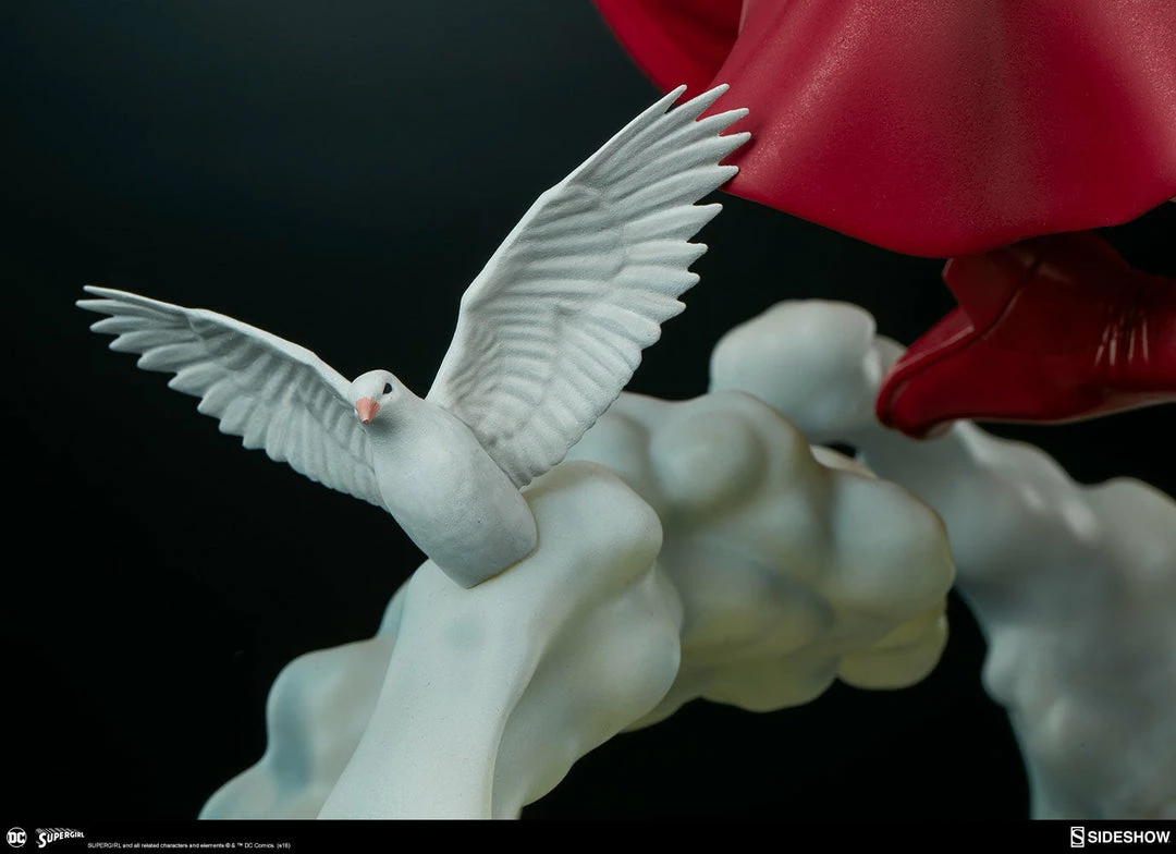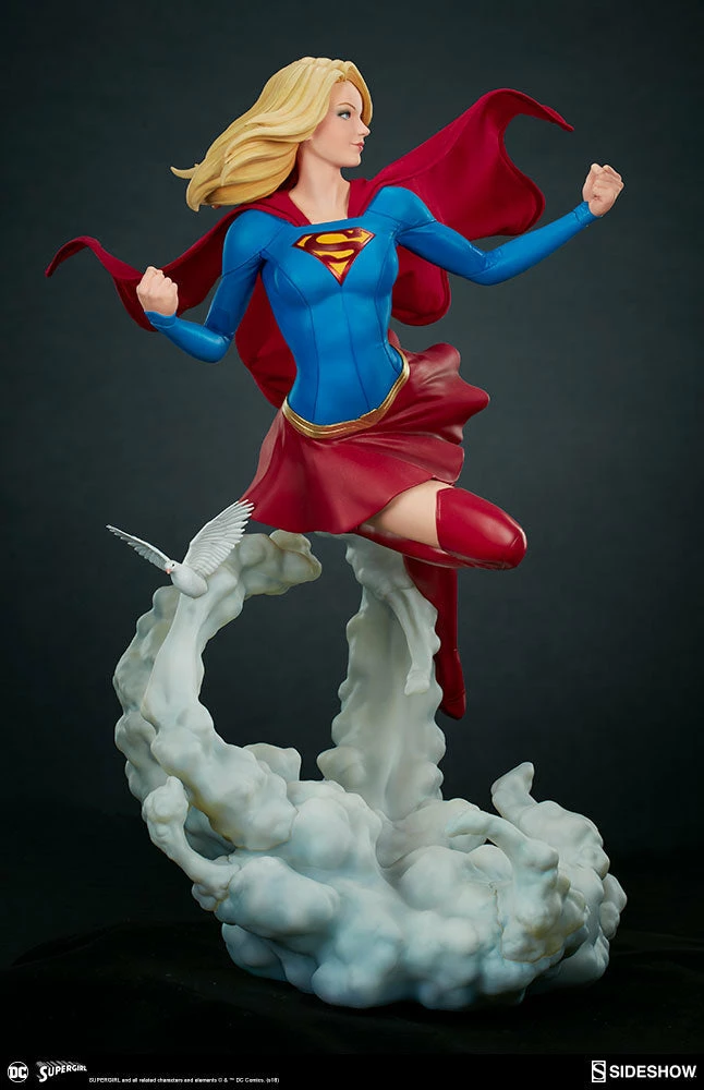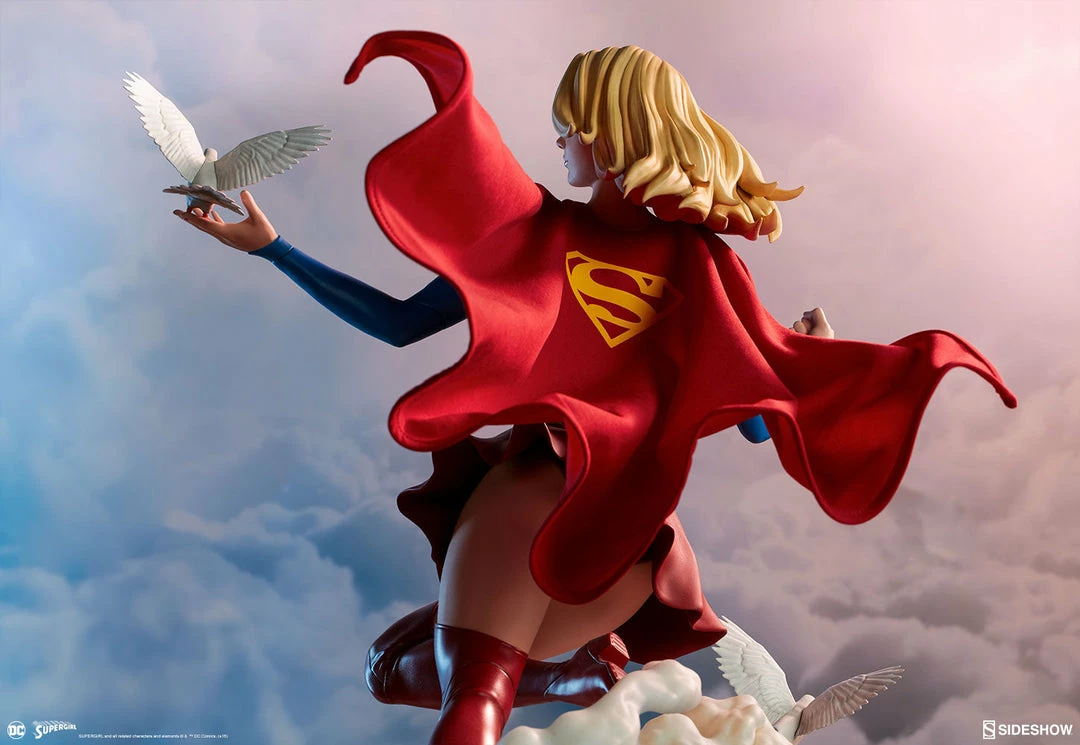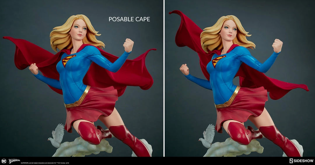 The polystone Supergirl Premium Format™ Figure has a sculpted blue costume with a dynamic red skirt and boots, with the iconic symbol of the House of El emblazoned on her chest. The figure also has a red fabric cape marked with her yellow symbol, with internal wiring to allow for custom cape posing options. Supergirl’s portrait has flowing blonde hair, and the figure includes an alternate left hand holding a white bird. Display Kara with a closed fist or with a feathered friend in both editions of this truly super figure.