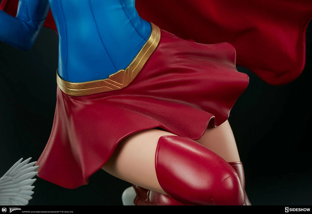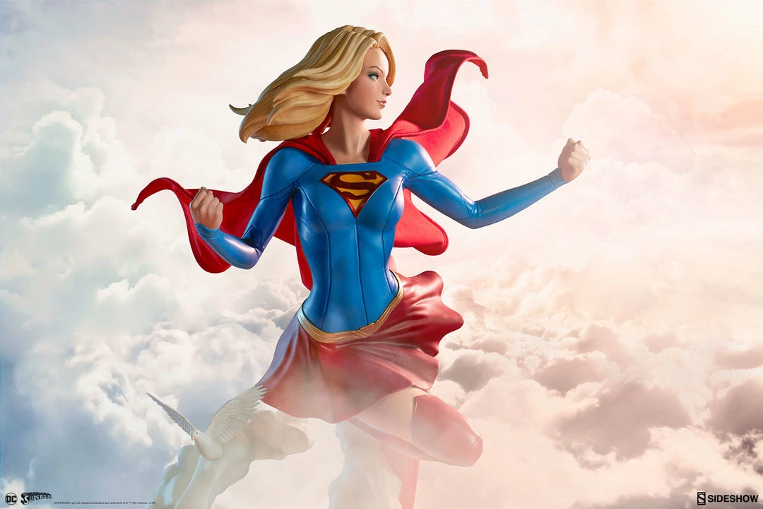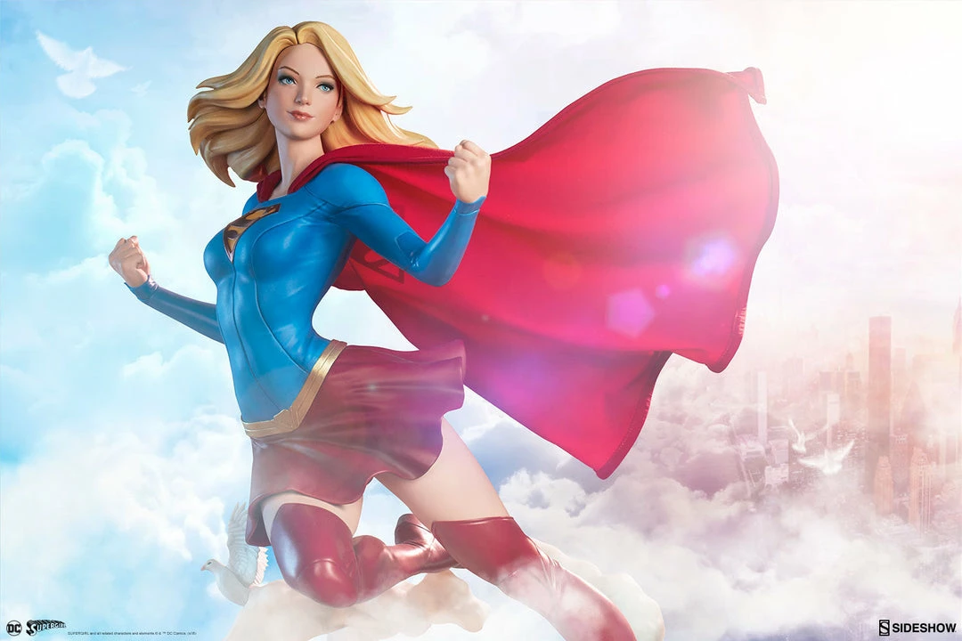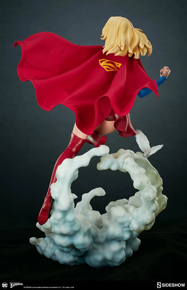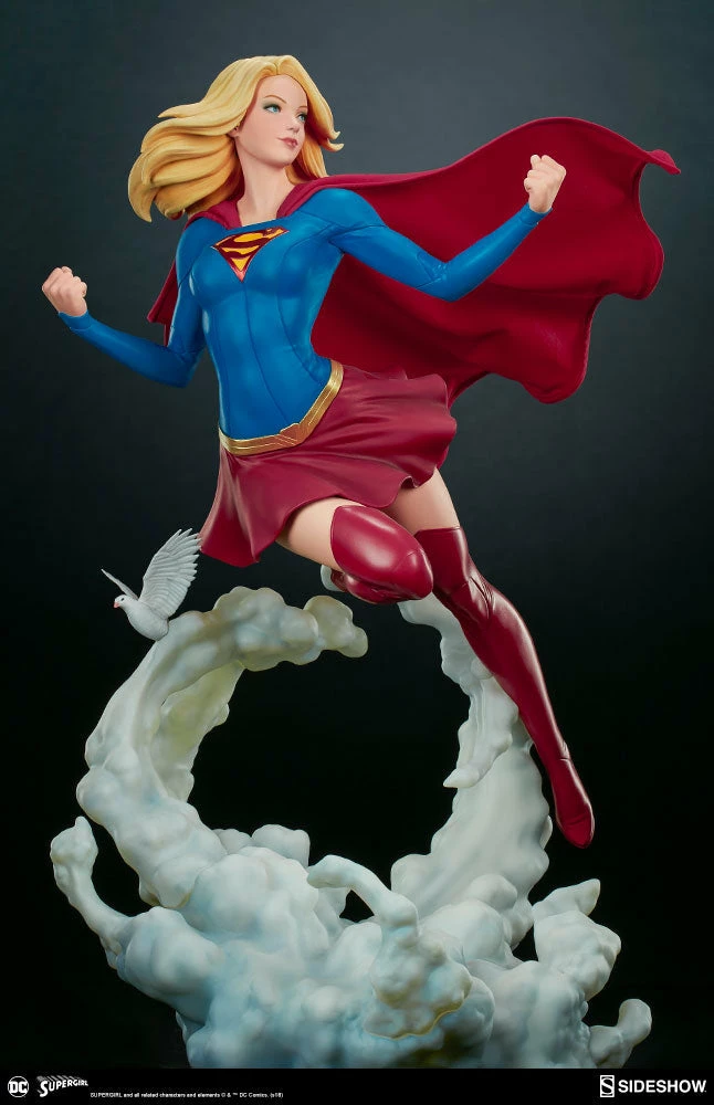The polystone Supergirl Premium Format™ Figure has a sculpted blue costume with a dynamic red skirt and boots, with the iconic symbol of the House of El emblazoned on her chest. The figure also has a red fabric cape marked with her yellow symbol, with internal wiring to allow for custom cape posing options. Supergirl’s portrait has flowing blonde hair, and the figure includes an alternate left hand holding a white bird. Display Kara with a closed fist or with a feathered friend in both editions of this truly super figure.