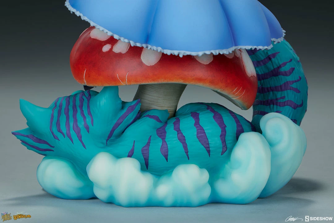 The Alice in Wonderland Statue measures 13.5” tall, as Alice sits atop a red dappled mushroom in the midst of the magical world of Wonderland, holding two segments of the size-changing toadstool in either hand. From the base of the figure, the blue and purple Cheshire Cat gives its famous toothy grin as it cleverly blends into the whimsical environment.