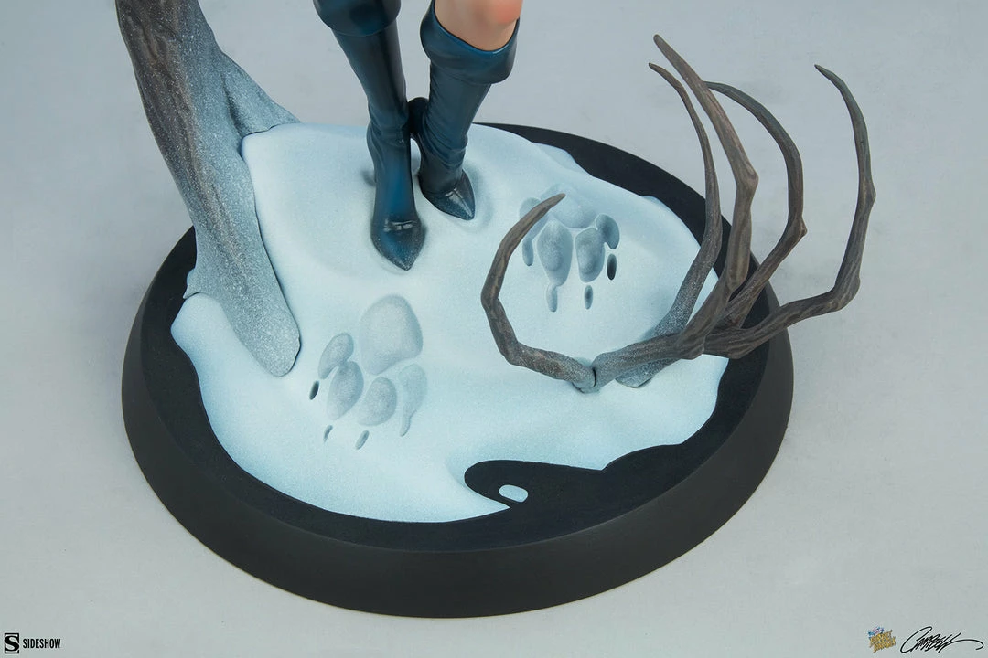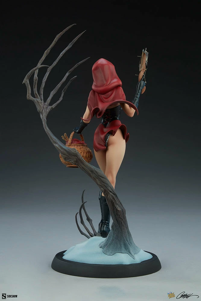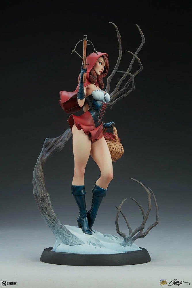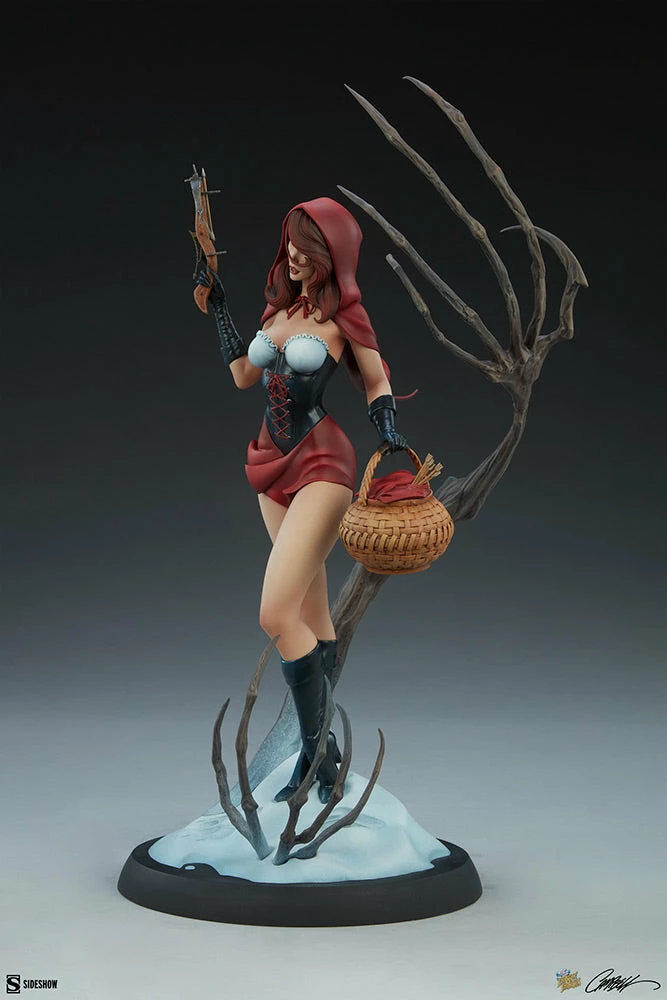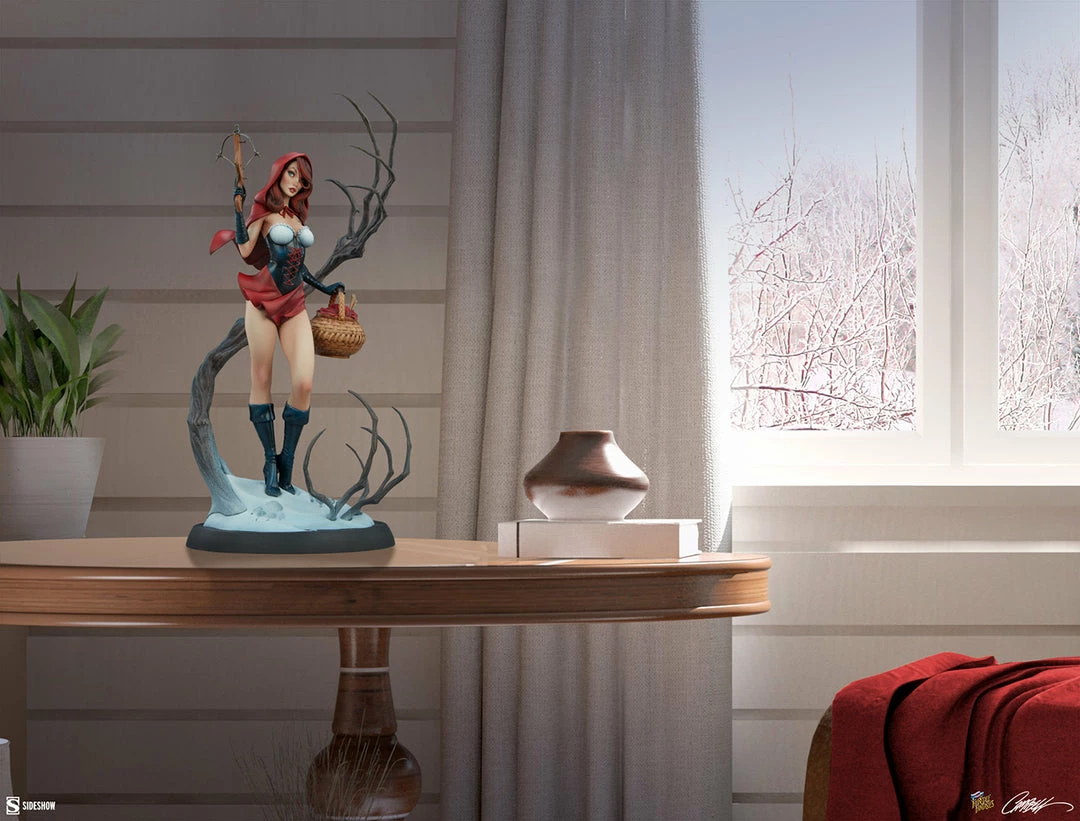 The polystone Red Riding Hood Statue measures 19” tall as the ruby-haired heroine wanders through a wintry woodland setting with her woven basket of goodies in tow. Claw-like trees reach out to grab at her as she tracks wolf prints in the snow, clutching her crossbow in case things get hairy. Red Riding Hood wears a fully sculpted costume designed with dynamic, windswept movement across her crimson capelet and skirt, giving the fierce and fearless femme an alluring pin-up appeal.