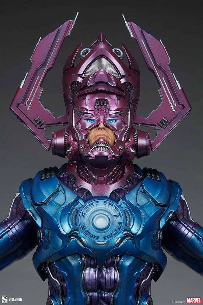 The polystone Galactus Maquette is a fully sculpted marvel of intricate armor and otherworldly might. Inspired by his iconic appearance in Marvel Comics, this maquette features an immensely detailed metallic blue and purple costume with silver accents, capturing the futuristic appearance of the unstoppable Galactus. His signature helmeted portrait reveals a hint of the man who became a god, known throughout the multiverse as the Hunger that Does Not Cease. With his intimidating physique, crackling heat effects on his hands, and an unrelenting need to draw strength from the cosmos, Galactus is sure to make a world-shattering centerpiece on any shelf.
