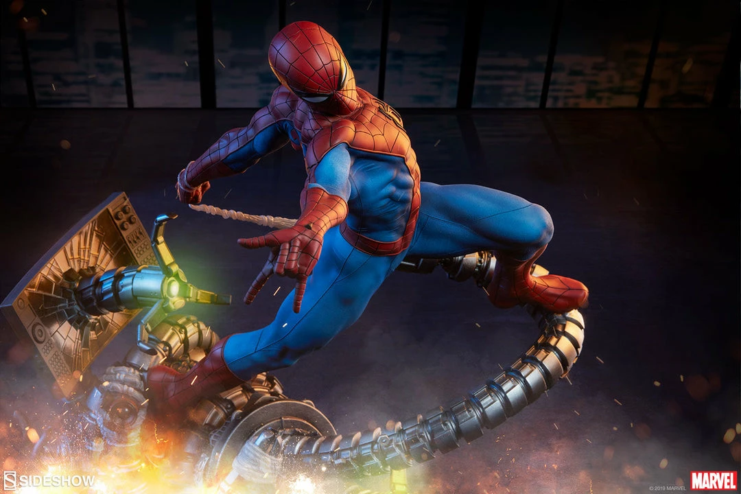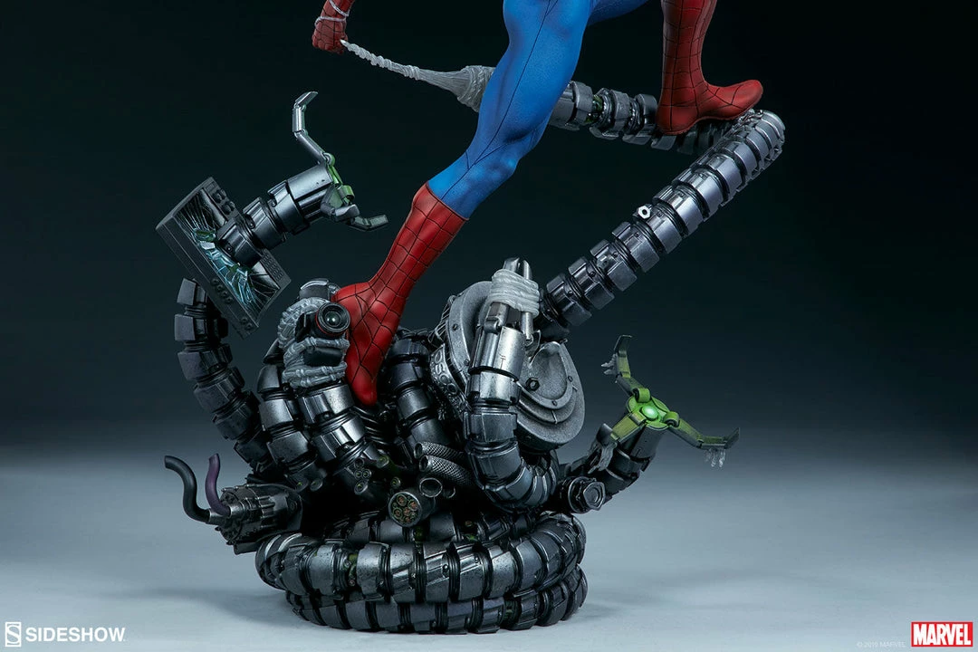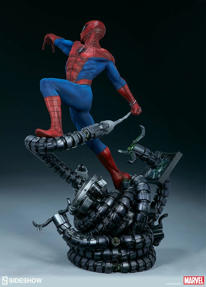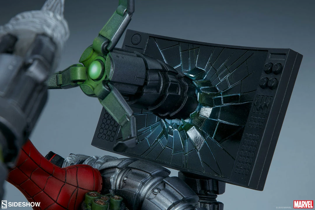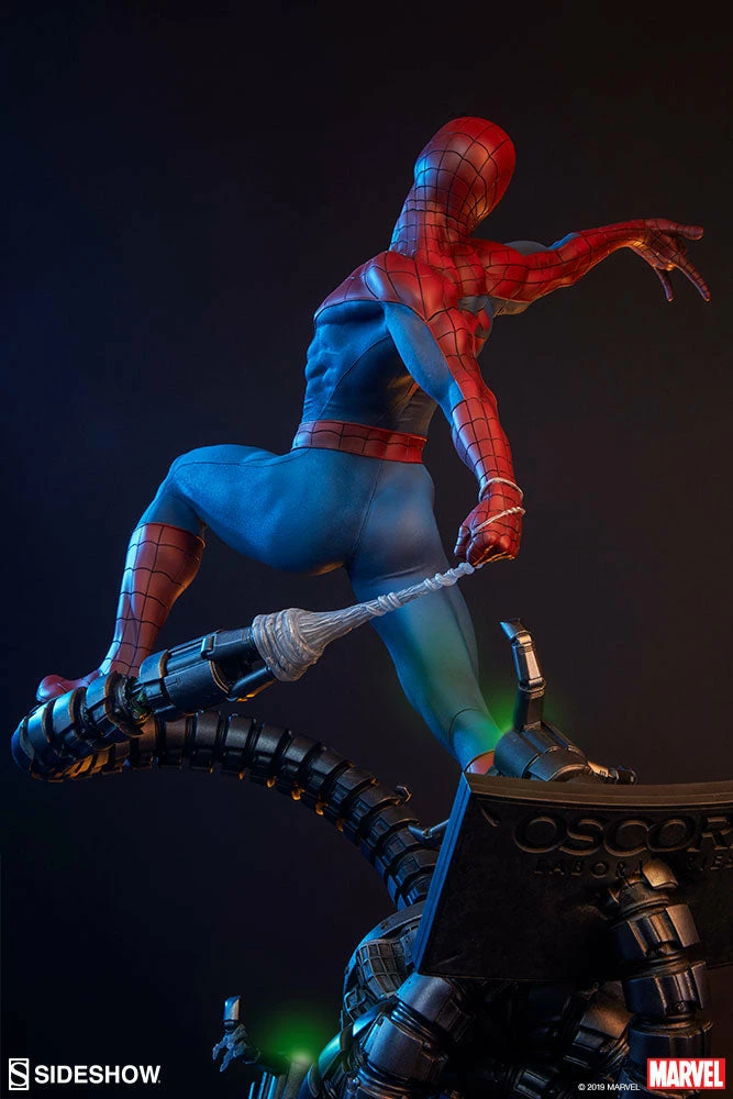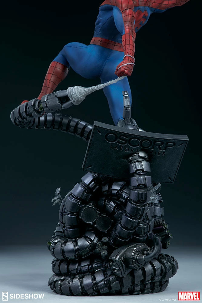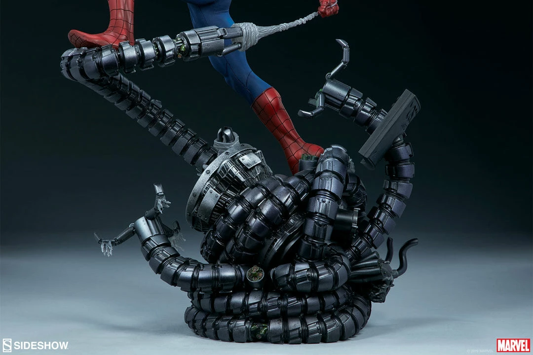 Just another day at the lab! The Spider-Man Premium Format™ Figure measures 22.5” tall as everyone’s favorite web-head wrestles with the tentacles of his foe Doctor Octopus on an Oscorp Laboratories-themed base. Peter Parker expertly avoids Doc Ock’s clawed clutches as the robotic arms coil around mangled monitors and machinery in an attempt to snare him.