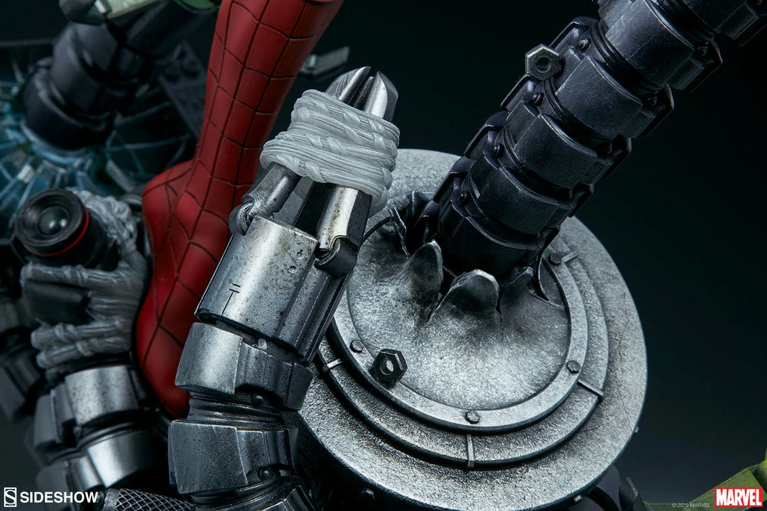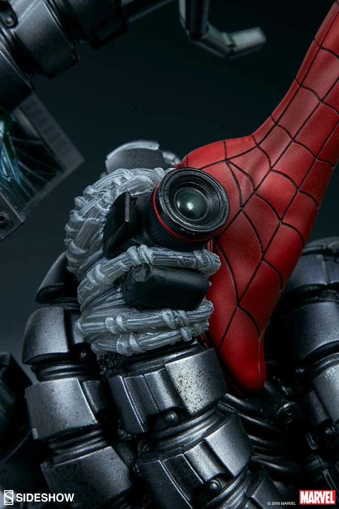 The polystone Spider-Man Premium Format Figure™ features a sculpted blue and red costume with varied textures and webbing elements on the gloves, boots, mask, and torso. The Spidey suit showcases Peter Parker’s athletic physique, with detailed musculature and realistic fabric-like movement. A number of webs wrap around the mechanical tentacles on the base, clamping the deadly claws shut and hiding Parker’s camera in the fray. The two open claws also include a light up feature, adding a sinister green glow to the scene.