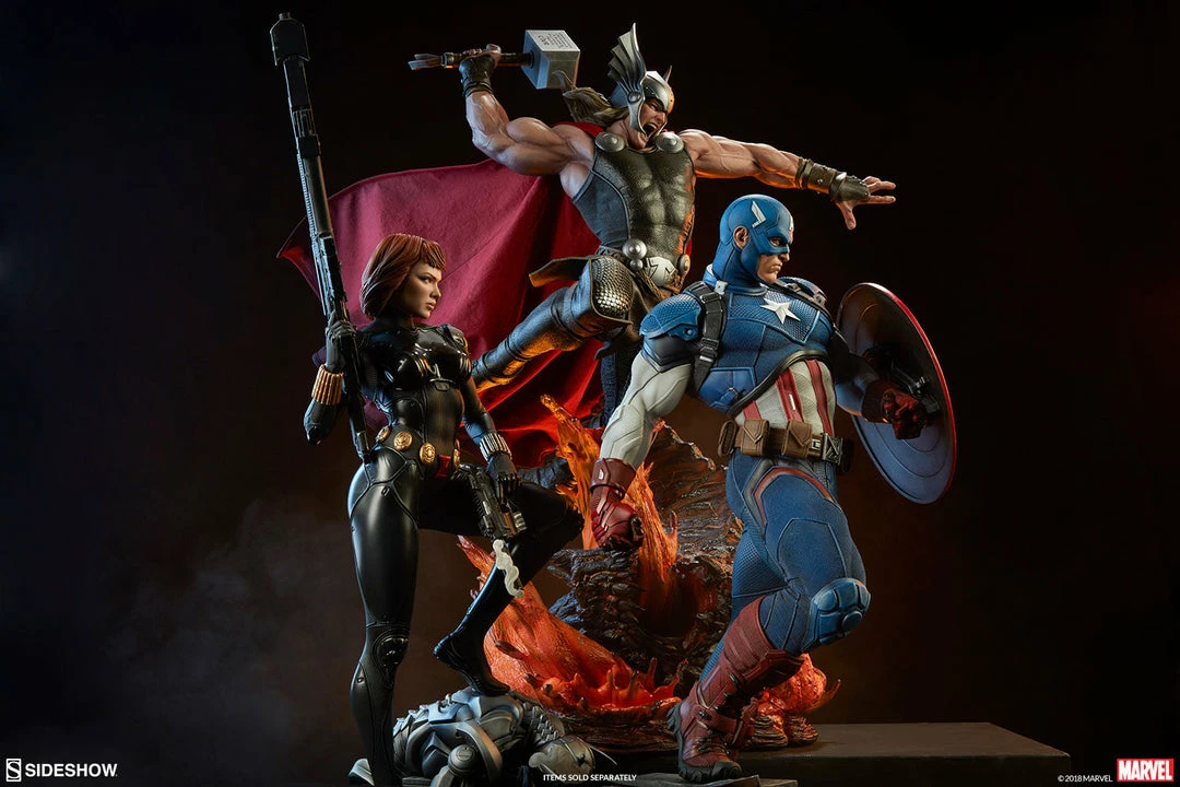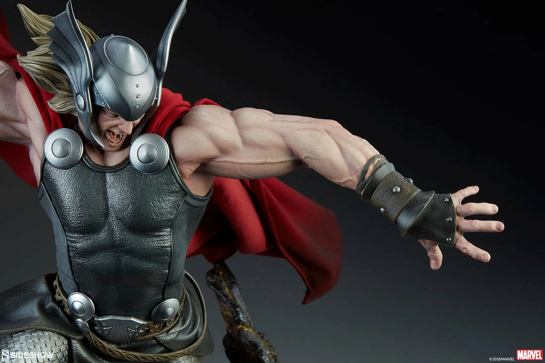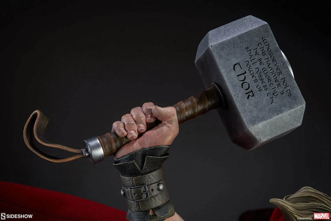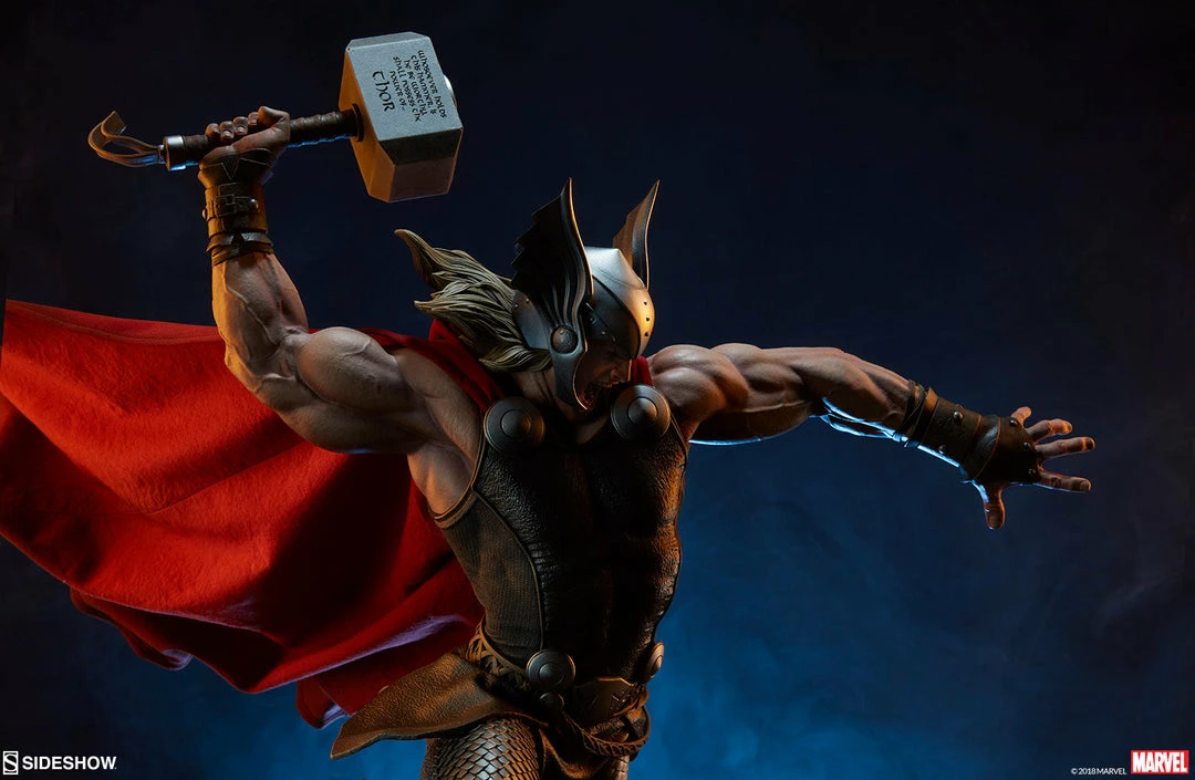 Thor, the Son of Asgard, has a godly physique with detailed musculature and a portrait with flowing blonde locks that truly captures his berserker fury. Worthy of Mjolnir’s might, Thor prepares to swing the mystical hammer, which bears its famous enchantment etched into the side.