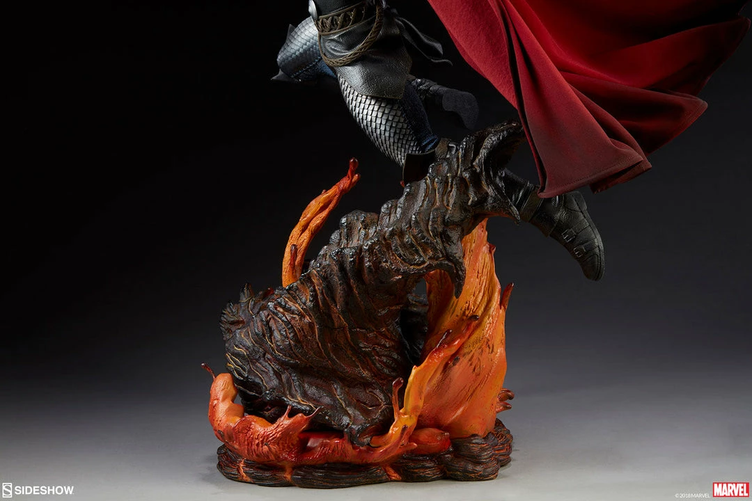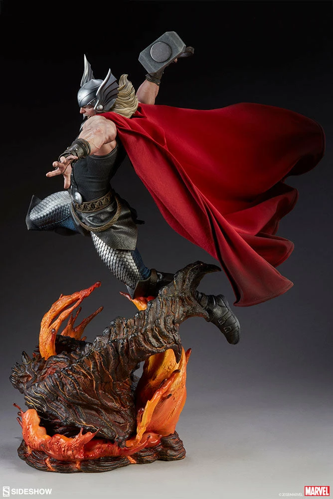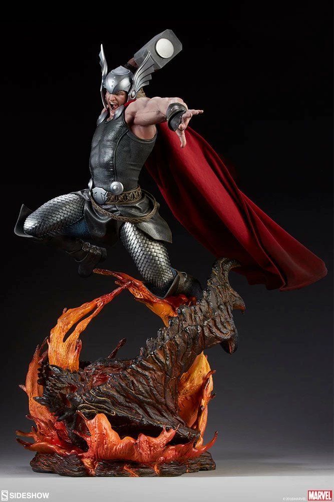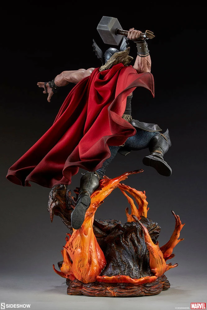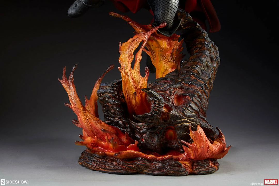 The Thor: Breaker of Brimstone Premium Format™ Figure measures 25.5” tall, as the God of Thunder summons the strength of Mjolnir to fight his molten foe Surtur. As Thor descends into the realm of Muspelheim, plumes of lava erupt from around the fire giant-themed base.