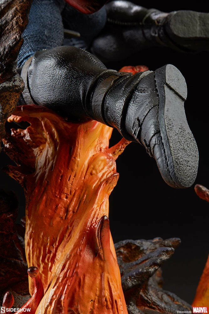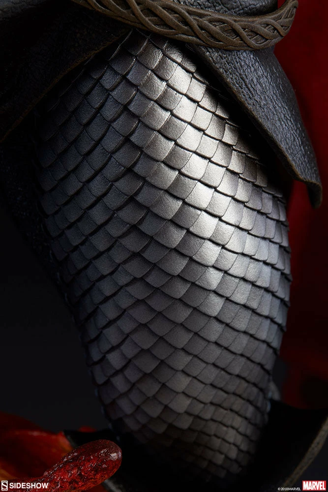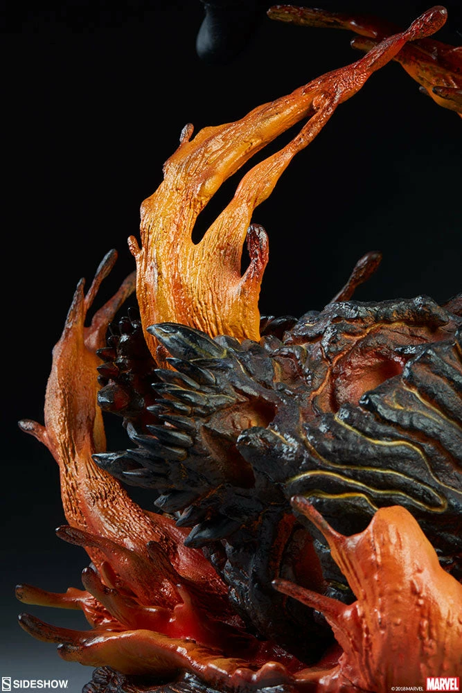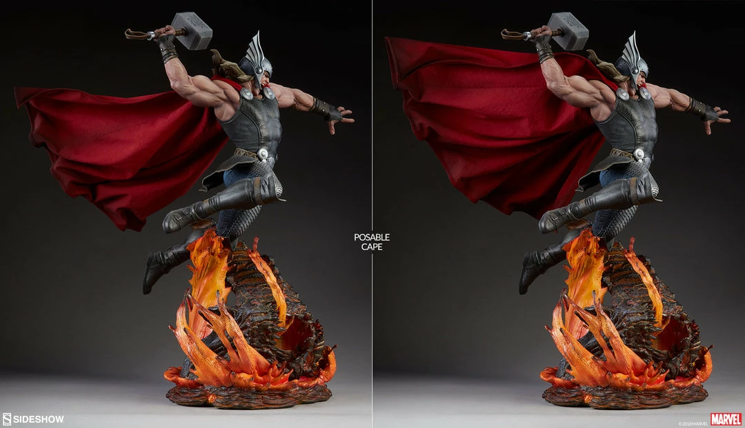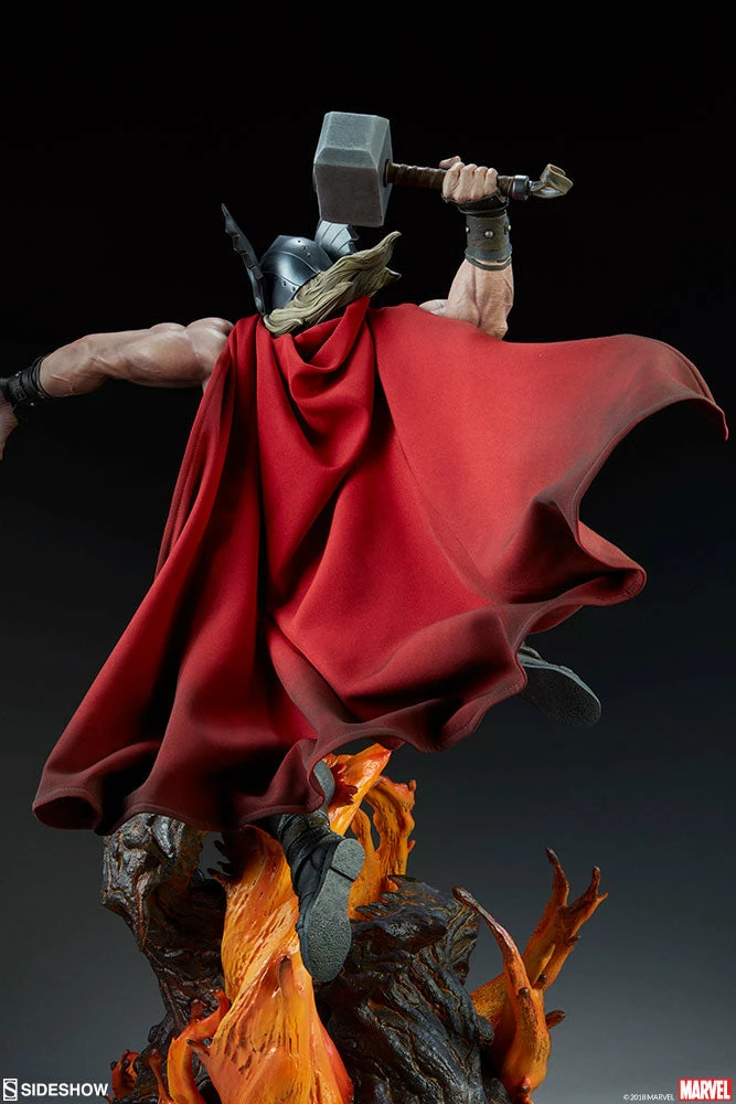 The Thor: Breaker of Brimstone Premium Format™ Figure measures 25.5” tall, as the God of Thunder summons the strength of Mjolnir to fight his molten foe Surtur. As Thor descends into the realm of Muspelheim, plumes of lava erupt from around the fire giant-themed base.