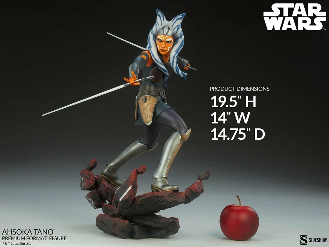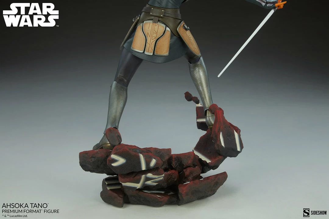 The Ahsoka Tano Premium Format Figure measures 19.5” tall and 14” wide as the Togruta warrior strikes a battle-ready stance on a Malachor-themed base, her iconic dual lightsabers at the ready. Surrounded by the crumbling structure of an ancient temple, Ahsoka steadies herself to use the Force and her former Jedi padawan training to confront the dangers of the dark side across the galaxy.