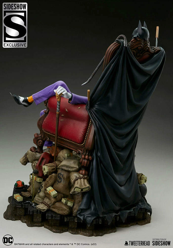 The Joker 1:4 Maquette measures 20” wide and about 26” tall when fully assembled — from the bottom of the base to the tippy top of the Batman’s cowl draped across the Clown Prince’s chair. This fully sculpted polyresin statue comes crammed with a bunch of trophies and toys from The Joker’s Gotham City escapades.