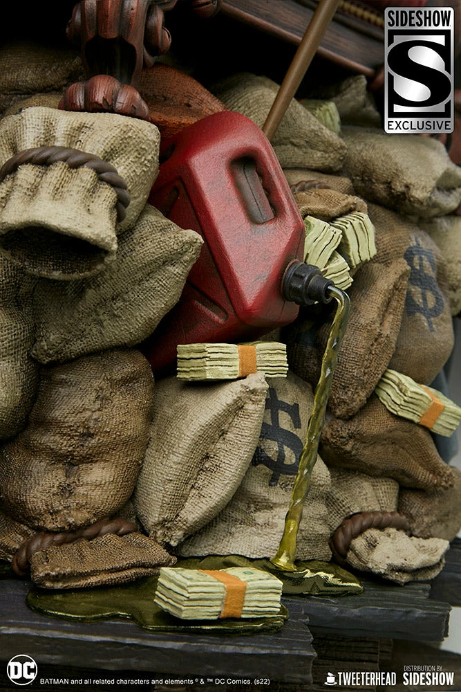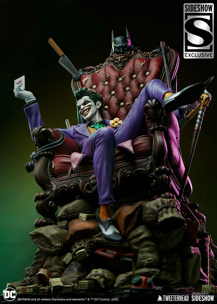 Armed with his gilded cane, a playing card, and bladed dress shoes, The Joker sits atop his personalized throne. He teeters precariously on a giant pile of spoils including money bags, gasoline tanks, bombs, and endless knick-knacks and knives. The maquette also includes an additional right hand holding a blade and an additional alternate style portrait, creating four total different ways you can display your newest Joker collectible. With so many Easter eggs and details, you’ll always find something new to love in this villainous piece!