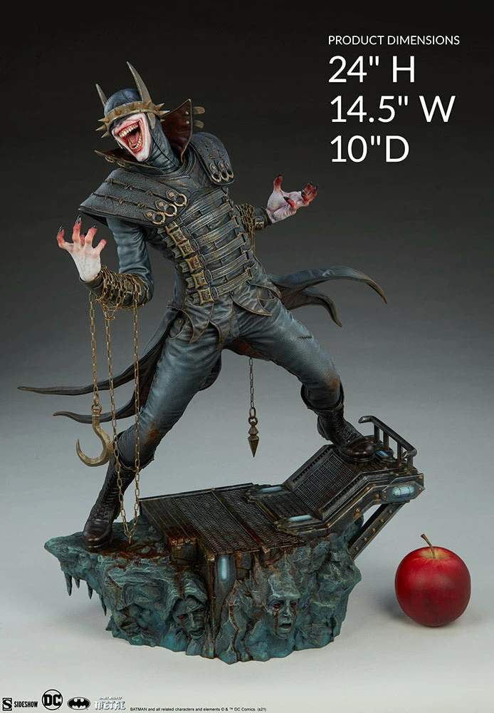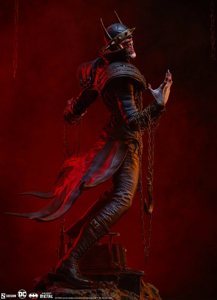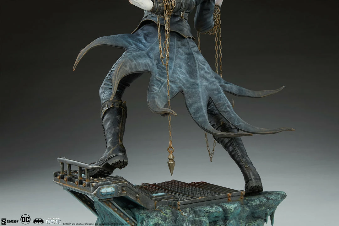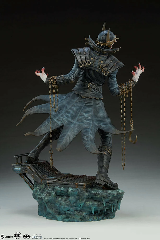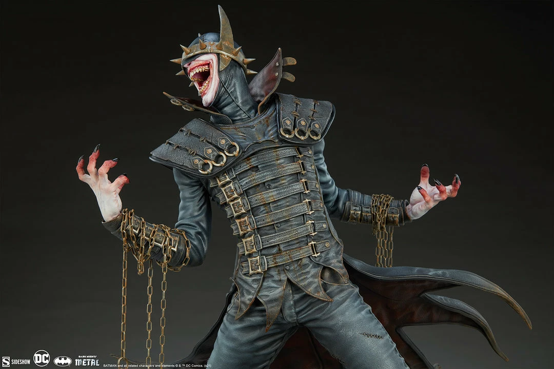 The polyresin Batman Who Laughs Premium Format Figure features a fully sculpted costume inspired by his now-iconic appearance in the Dark Nights: Metal series from DC Comics. His flared coat is detailed with realistic leather-like textures, binding him in a bevy of belts, straps, and stitches that evoke a straitjacket motif. His arms are also wrapped in metal chains. True to his name, the Batman Who Laughs has his mouth thrown open wide in a wicked laughing expression that captures the madness and glee of the mind behind his spiked Dark Metal Visor.