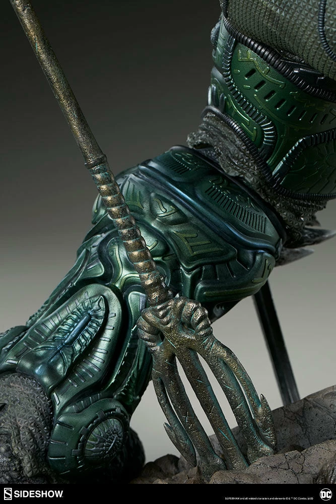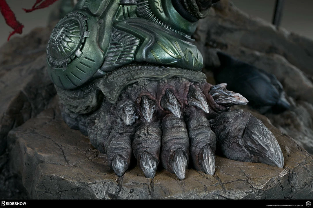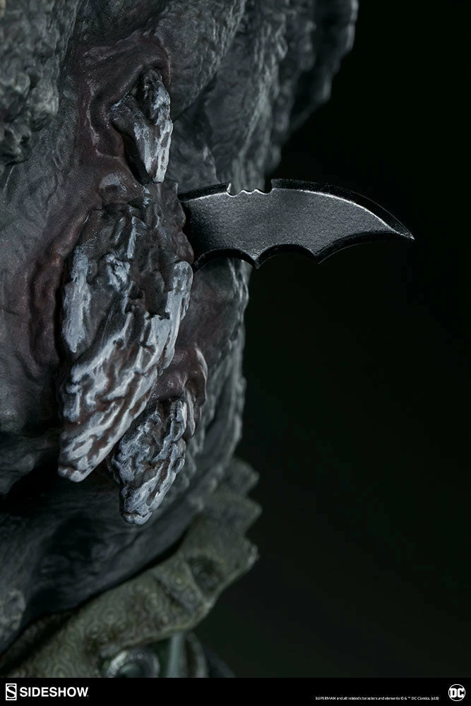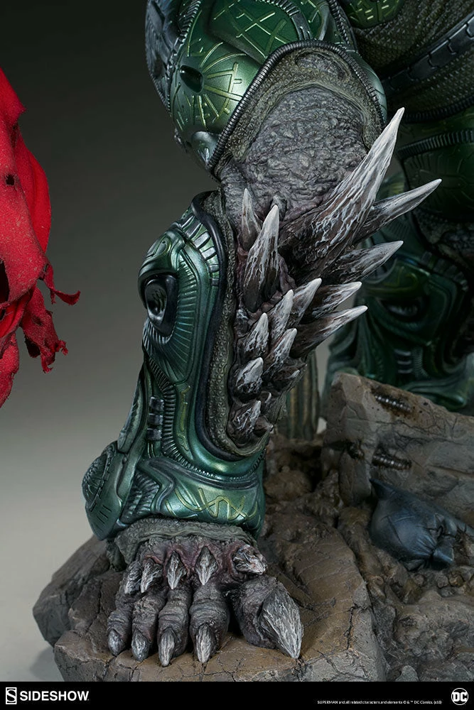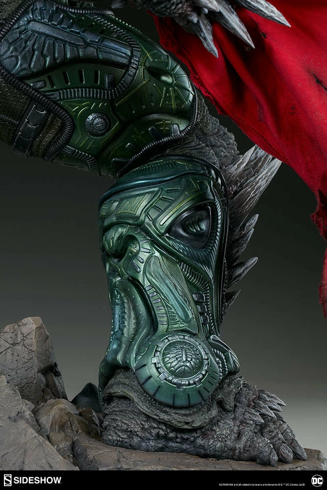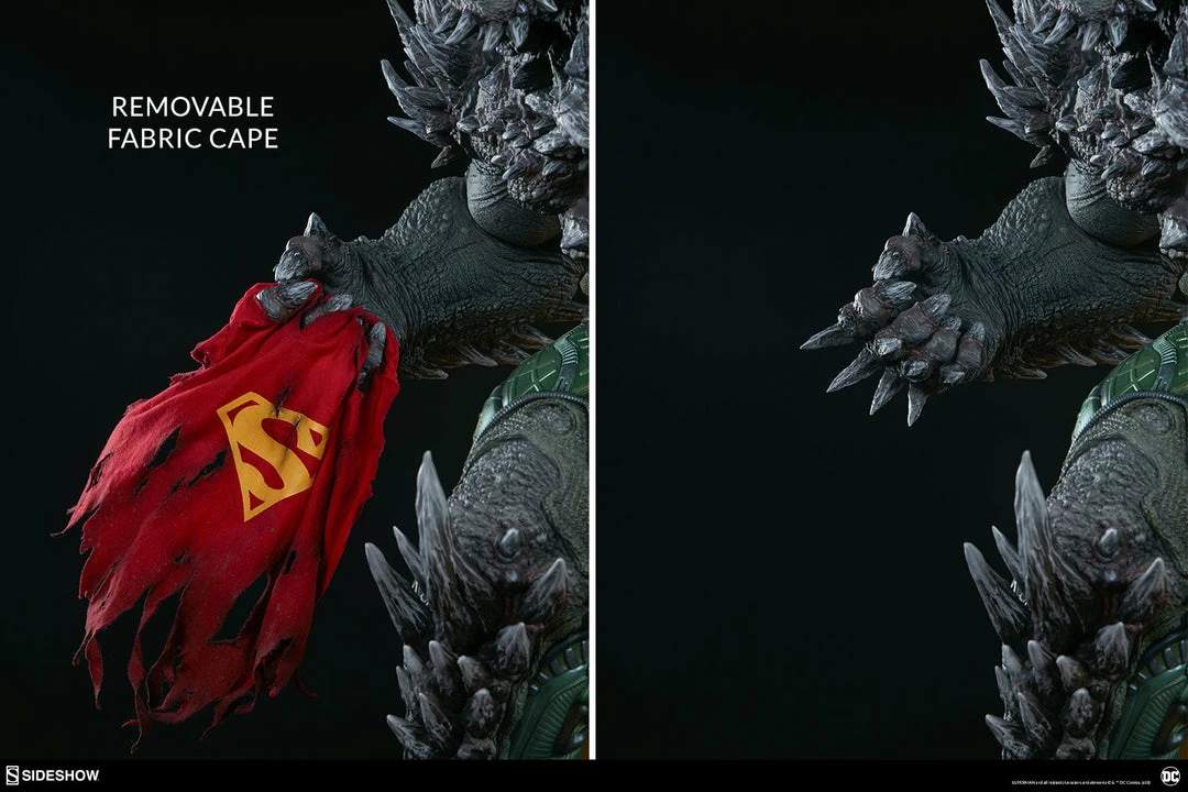 Measuring a monstrous 26.5” tall, the Doomsday Maquette is the ultimate fearsome foe, created from the violence of prehistoric Krypton. Doomsday stands astride a rubble environment base littered with relics from the valiant heroes who have fallen in his wake. Wonder Woman’s sword, Aquaman’s trident, and Batman’s cowl all serve as trophies at Doomsday’s feet while a number of Batarangs are embedded into his chest and shoulders. In his right hand he clutches the fabric tatters of Superman’s cape, which includes internal wiring for posing and can be removed from the figure. On his left hand, the villain has forced an inert Green Lantern ring onto his finger in a brutal display of force.