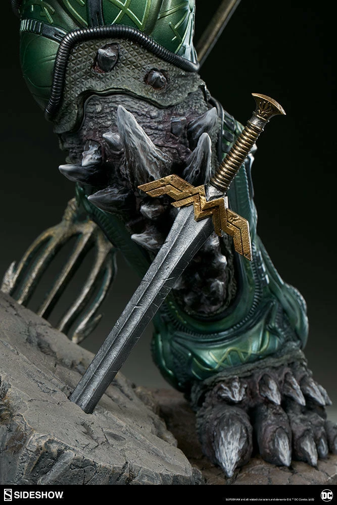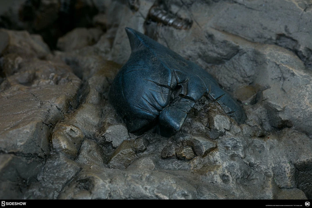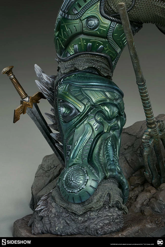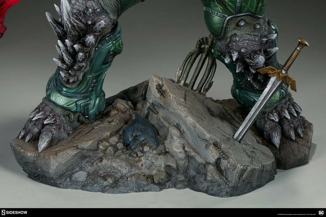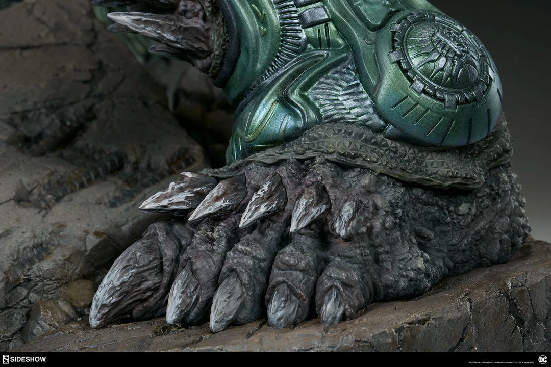 Measuring a monstrous 26.5” tall, the Doomsday Maquette is the ultimate fearsome foe, created from the violence of prehistoric Krypton. Doomsday stands astride a rubble environment base littered with relics from the valiant heroes who have fallen in his wake. Wonder Woman’s sword, Aquaman’s trident, and Batman’s cowl all serve as trophies at Doomsday’s feet while a number of Batarangs are embedded into his chest and shoulders. In his right hand he clutches the fabric tatters of Superman’s cape, which includes internal wiring for posing and can be removed from the figure. On his left hand, the villain has forced an inert Green Lantern ring onto his finger in a brutal display of force.