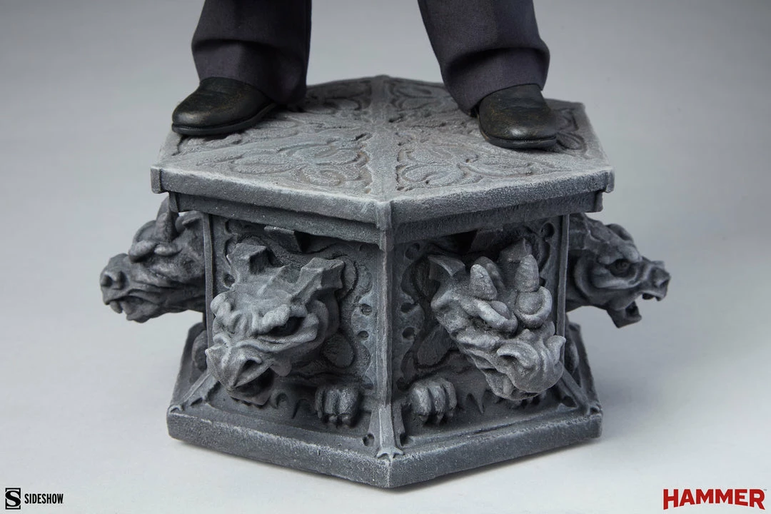 The Van Helsing Premium Format measures 21.5” tall on top of a stone-like base with Gothic gargoyles, creating an air of dread as the famed vampire hunter steadies himself to pursue the fiendish Count Dracula. Sculpted with an incredibly detailed likeness of actor Peter Cushing in the iconic role, this statue captures an expression of fearlessness and resolve, with Cushing’s wide blue eyes, furrowed brows, unmistakable cheekbones, and carefully styled hair.