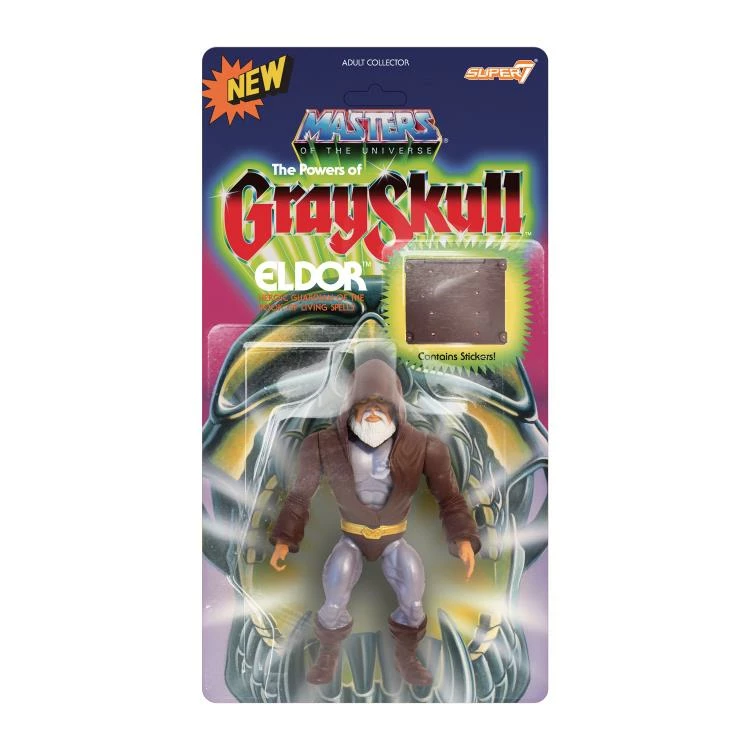 The Power of Grayskull Eldor 5.5″ Vintage figure comes with Book of Living Spells accessory and features a spring-loaded mechanism: Turn the waist and he swings back with a punch! The packaging includes a custom character history booklet with stickers and has new and original art on the back of the card.