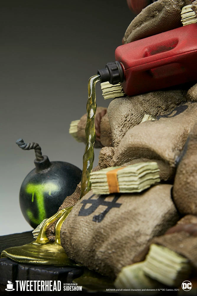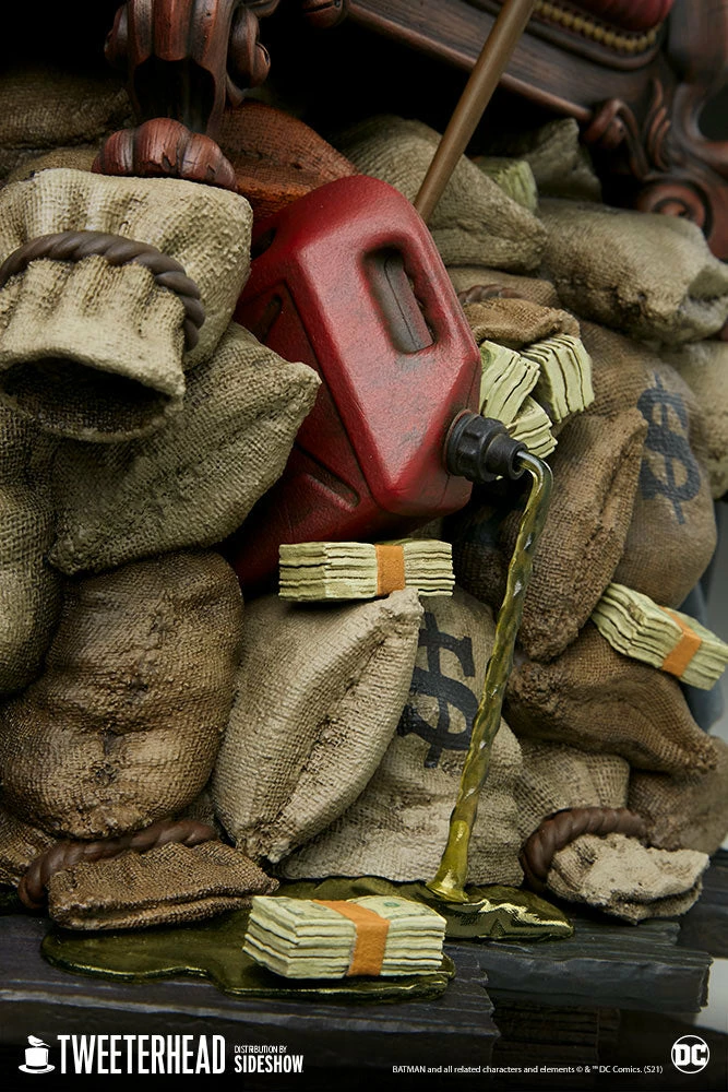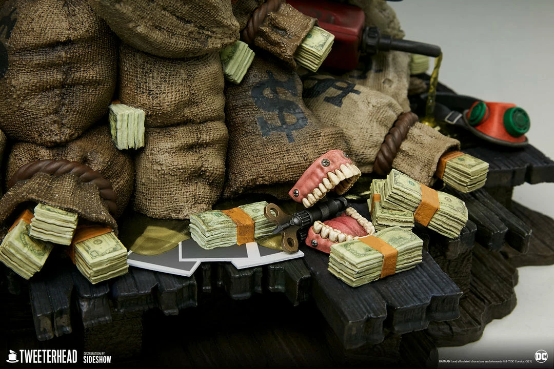 The Joker Deluxe Maquette measures close to 20.5” tall when fully assembled – from the bottom of base to the tippy top of the Batman’s cowl on the chair. This fully sculpted polyresin statue comes crammed with a bunch of craziness – Joker sitting atop his personalized throne with a Bat-cowl and cape, armed with his cane and bladed shoe. All nested on a giant pile of money bags, gasoline tanks, bombs, and endless knick-knacks and easter eggs, you’ll probably never stop finding something new to love in this piece.