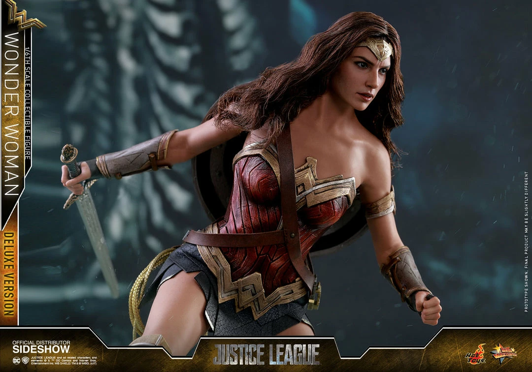 Aside from the amazingly detailed costume, the figure also comes with assorted weapons and accessories such as a sword, a shield with weathering effect, two pairs of Wonder Womans signature Bracelets of Submissions, her Lasso of Truth, bullet sparkling effects, and a specially designed Justice League themed figure stand.