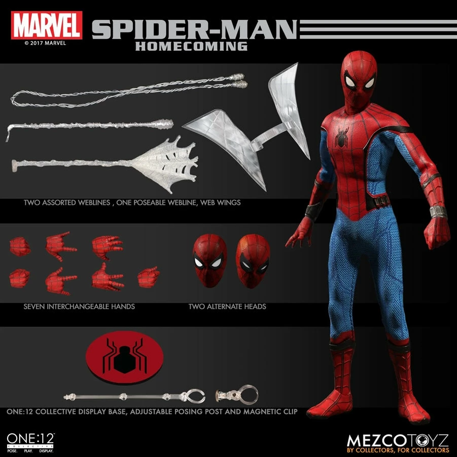 Spider-Man Homecoming joins the One:12 collective. With a comprehensively detailed film-accurate outfit and unique character specific accessories. This figure also features a newly sculpted body to accurately reflect the slender, teenage frame of Spider-Man in the new movie.