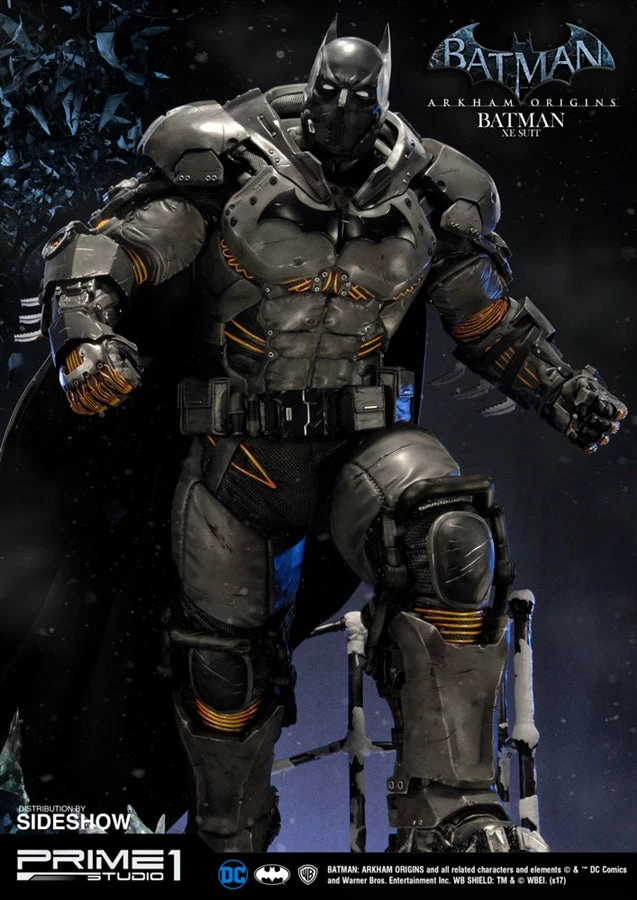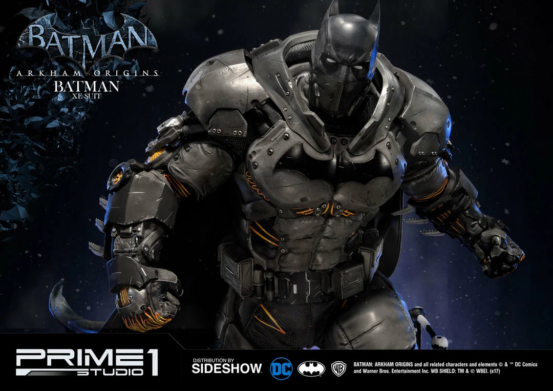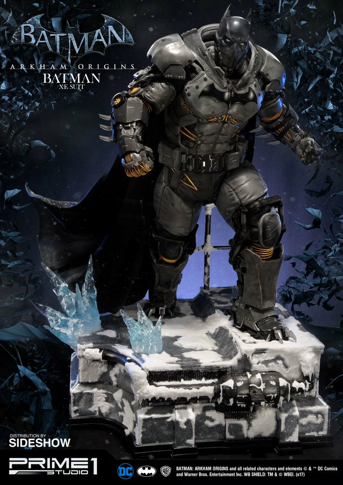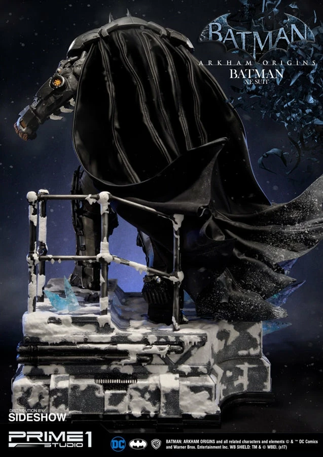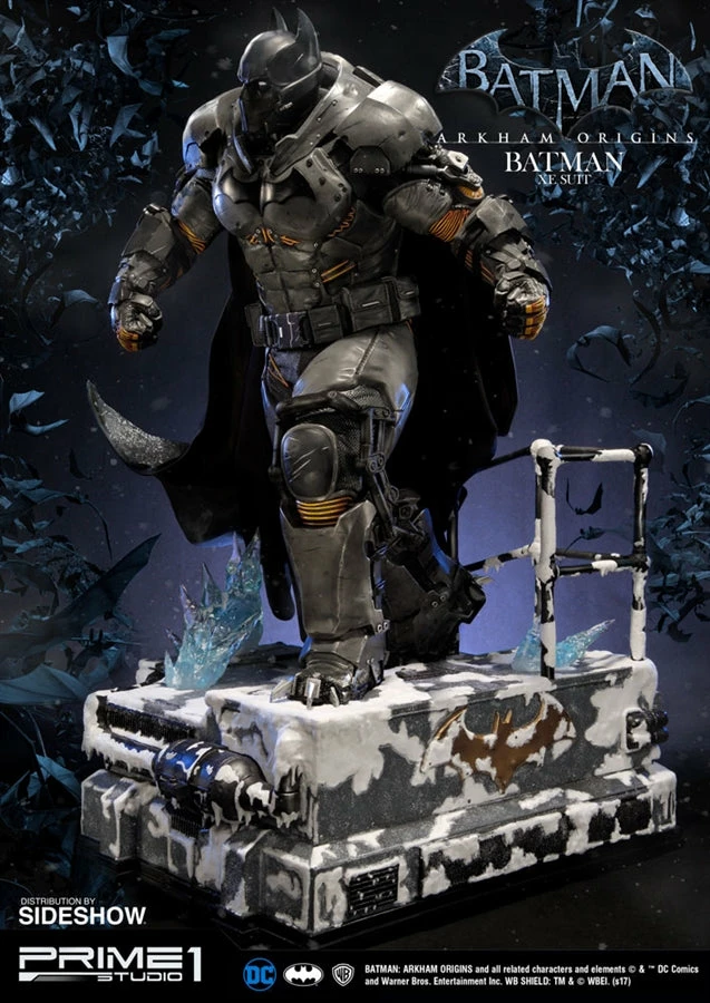 Sideshow and Prime 1 Studio are proud to present the Batman Extreme Environment Suit from Batman: Arkham Origins (Cold, Cold Heart DLC). Batman started out using the Arkham Origins Batsuit but switched to the XE Suit after he realized that he needed a more armored Batsuit to take on the likes of Mister Freeze. It had heating on some of the areas of the suit, it was armed with Thermal Gloves. This special version of his Batsuit not only offered him greater protection but also allowed him to take Mr. Freeze head on as the suit was able to withstand the extreme temperature and break the ice he was able to create. A perfect duo with the Mr. Freeze from Batman: Arkham Origins.