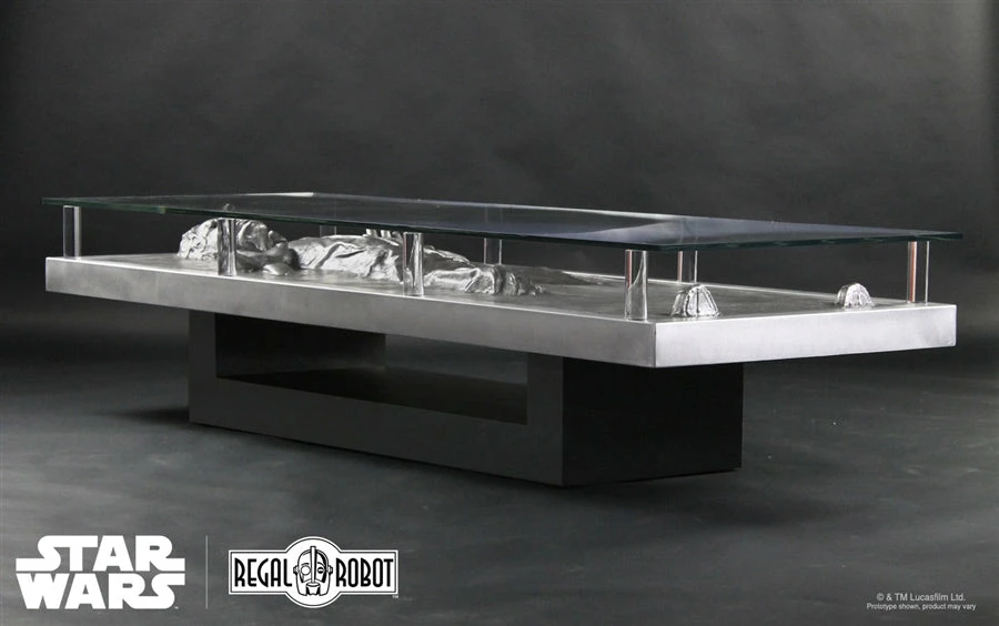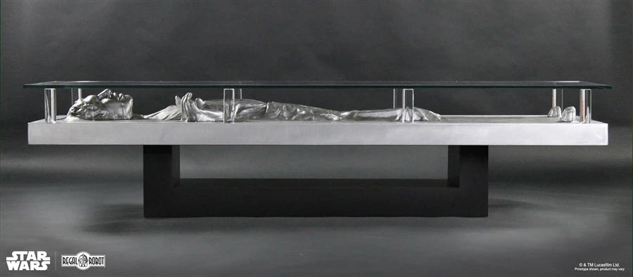 Best of all, the coffee table features a life-size interpretation of Han Solo encased in carbonite!
