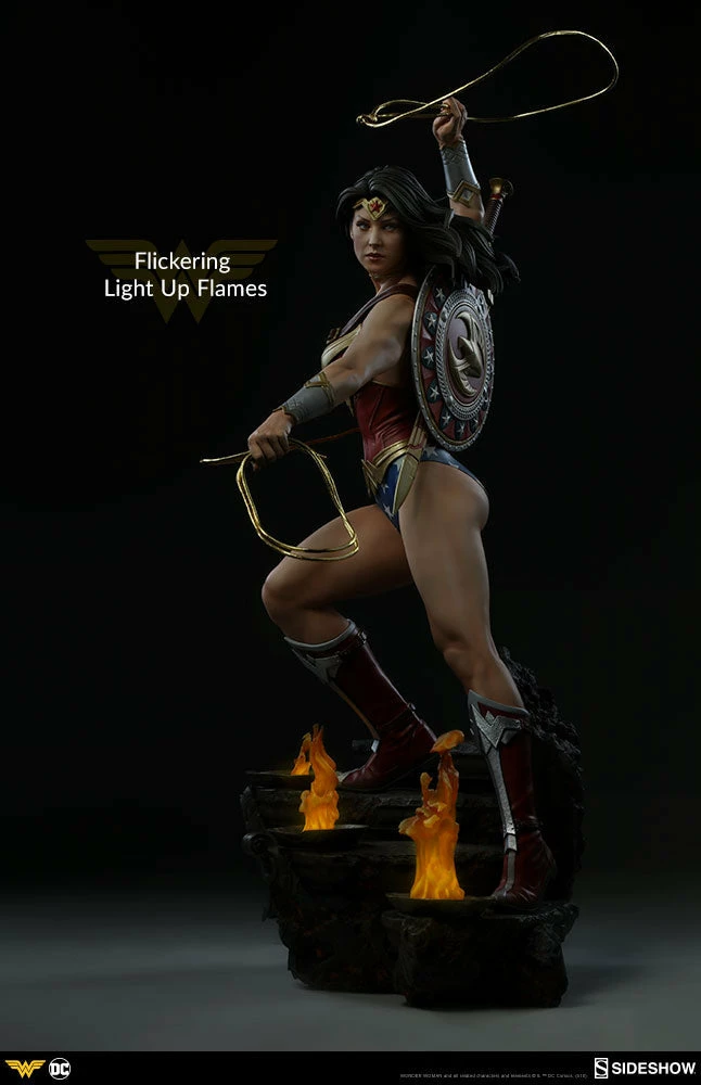 Measuring 22 tall, Wonder Woman stands on guard as she descends a blackened staircase to Hades, lined with clear resin flames that include a flickering light-up feature. The sculpted underworld staircase is detailed with molten orange hues, as well as the shadowy portraits of helmeted warriors, inspired by classical statues.